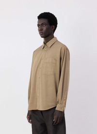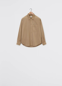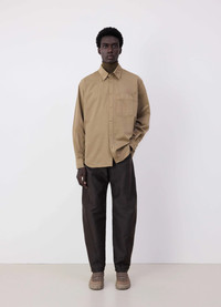 This Relaxed Workwear Shirt is a new addition to the LEMAIRE vestiaire. It is made of a light cotton and satin blend that has been delicately garment-dyed, for a softer hand. The fabric enhances the fluidity and lightness of the garment. The fit is very relaxed thanks to the dropped shoulder and the dropped centre front and neckline, allowing ample room to the neck even when fully fastened. The front pocket houses a smaller pocket peeking out of it. This silhouette features a double topstitch detail through the front and the cuffs, and there is a box pleat in the back. DETAILS - Relaxed fit - Double chest pocket - Dropped shoulder - Double topstitching - Corozo buttons Made in Romania Style: SH1137 LF1206 FABRICS & CARE Main Fabric: 100% Cotton Soft wash 30° Do not bleach Do not tumble dry Cool ironing Soft dry clean