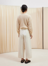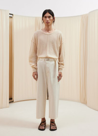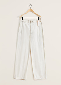 These pants are a new addition to LEMAIRE’s wardrobe. They are made in a cotton bachette that has been washed, granting a soft hand to the garment as well as enhancing workwear details. The Seamless Belted Pants features a matching belt with a metal closure, an asymmetrical belt loop at the front, one concealed closure, two side pockets and two patched pockets on the back. DETAILS Straight fit Belted Two side pockets Two patched pockets on the back Made in Romania Style: PA1106 LF1220 FABRICS & CARE Main Material: 100% Cotton Main Lining: 100% Cotton Soft wash 30° Do not bleach Do not tumble dry Cool ironing Soft dry clean