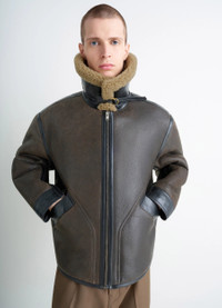 This shearling coat is reinterpreted with contrasting leather trim. The silhouette is radical, with a generous collar that can be raised and closed with a metal buckle. The model is 187 cm tall and is wearing a size 48 (M). This shearling coat is reinterpreted with contrasting leather trim. The silhouette is radical, with a generous collar that can be raised and closed with a metal buckle. The model is 187 cm tall and is wearing a size 48 (M). DETAILS Shearling coat Straight cut Lambskin fur interior Turn-down collar with lambskin fur lapel Chin strap with tab and metal ring Front zip closure Side pockets Long sleeves Zipped cuffs Snap tabs on the sides Contrasted leather details Interior Lemaire embossed leather label Made in Turkey Style : CO1140 LL0092 The model is 187 cm tall and is wearing a size 48 (M). Shearling coat Straight cut Lambskin fur interior Turn-down collar with lambskin fur lapel Chin strap with tab and metal ring Front zip closure Side pockets Long sleeves Zipped cuffs Snap tabs on the sides Contrasted leather details Interior Lemaire embossed leather label Made in Turkey Style : CO1140 LL0092 The model is 187 cm tall and is wearing a size 48 (M). CARE Main Material: 100% Lamb Leather Second Material: 100% Cow Leather Main Lining: 100% Cotton Do not wash Do not bleach Do not tumble dry Do not iron Professional leather clean only Main Material: 100% Lamb Leather Second Material: 100% Cow Leather Main Lining: 100% Cotton Do not wash Do not bleach Do not tumble dry Do not iron Professional leather clean only