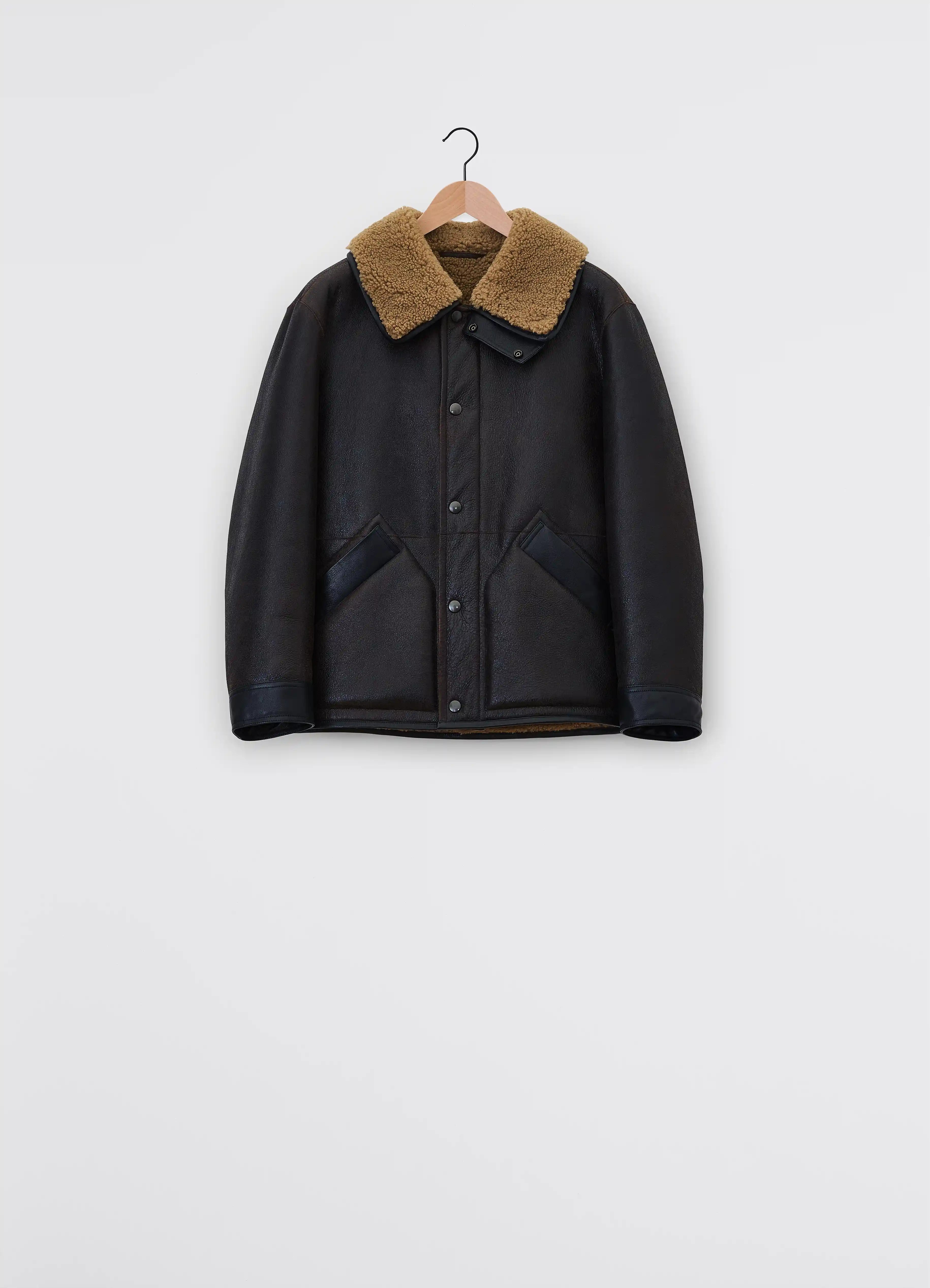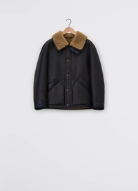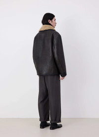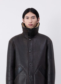 This Shearling Coat is a new outdoor essential complementing the LEMAIRE vestiaire. Crafted from heavy lamb shearling, it offers a soft and warm touch, with grained cow leather details adorning the pockets, adjuster, and neckline. The straight-cut, boxy silhouette boasts a protective tap running along the bottom hem, for added structure. Gunmetal snaps adorn the front and collar, allowing for secure fastening. Fully lined in shearling, including the pockets, this garment offers enhanced protection and warmth. DETAILS - Boxy fit - Two shearling lined pockets - Adjustable collar - Gunmetal snap buttons Made in Turkey Style: CO1080 LF1320 FABRICS & CARE Main Fabric: 100% Second Fabric: 100% Cow Do not wash Do not bleach Do not tumble dry Do not iron Professional leather clean only