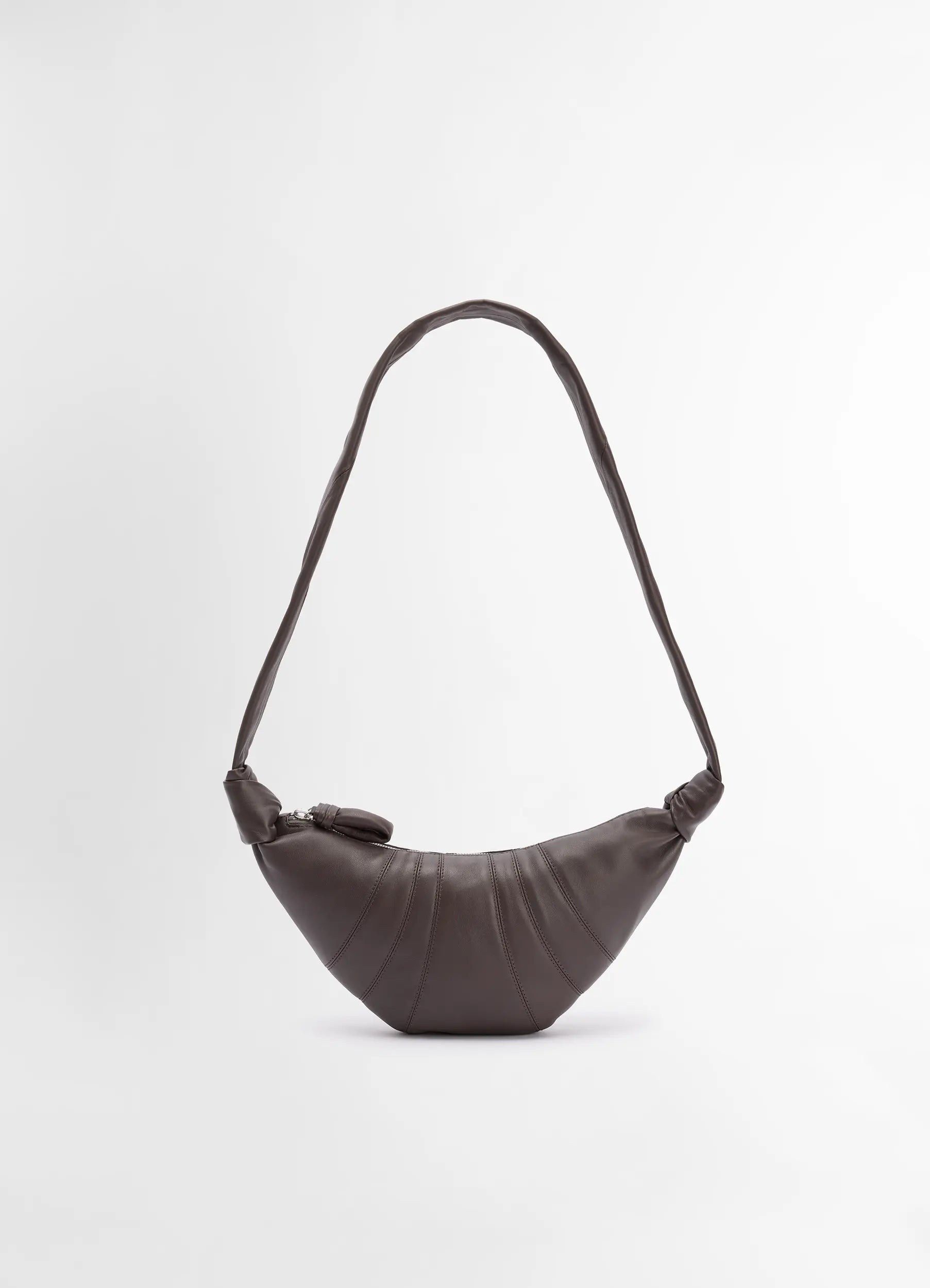 This classic LEMAIRE bag is part of the iconic Croissant family. The Small Croissant is made of soft lamb nappa leather, a supple yet resistant fabric. Its smooth surface adds a tactile element and contributes to the durability of the bag’s curve. Inspired by the shape of the eponymous pastry, its design is achieved through an assembly of top-stitched cutouts, blending style and functionality. It features a matching looped zip puller and side knot finishing and has the capacity for small accessories such as a smartphone, a card holder and a wallet. This versatile style can be worn over the shoulder or cross-body. DETAILS - This bag can be worn on the shoulder or cross-body - Height of the shoulder strap: 43cm / 17-in - Length: 35cm / 14-in - Width: 16cm / 6-in - Depth: 5cm / 2-in - Lining in cotton canvas - Metal Looped zip puller - Small interior patch pocket (can contain cards, small keys or a public transportation pass) - Main compartment (can contain smartphone, card holder, Airpods Pro 2 case and wallet) - Side knot finishings - Embossed logo inside Made in Spain Style: BG0003 LL095 FABRICS & CARE Main Material : 100% Cow Main Lining : 100% Cotton