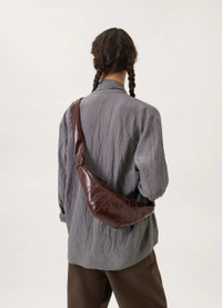 This classic LEMAIRE bag, the smallest of the Croissant Bag family, is made of coated cotton with a crisp texture and a shiny finish. Inspired by the shape of a croissant pastry, the bag's design is achieved through an assembly of topstitched cutouts. It features a matching looped zip puller and side knot finishings, and is worn as a shoulder or crossbody bag. DETAILS Cotton canvas lining Metal zip Interior patch pocket Length 16 cm Width 35 cm Depth 5 cm Made in Tunisia Style : BG0003 LF1073 FABRICS & CARE Main Material: 100% Cotton Main Lining: 100% Cotton Do not wash Do not bleach Do not tumble dry Do not iron Professional cleaner only