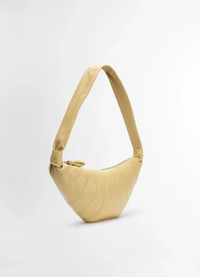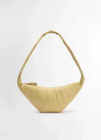 This classic LEMAIRE bag is part of the iconic Croissant family. The Medium Croissant is made of soft lamb nappa leather, a supple yet resistant fabric. Its smooth surface adds a tactile element and contributes to the durability of the bag’s curve. Inspired by the shape of the eponymous pastry, its design is achieved through an assembly of top-stitched cutouts, blending style and functionality. It features a matching looped zip puller and side knot finishings and has the capacity for accessories such as a smartphone or 4x7-inch book. This versatile style can be worn over the shoulder or cross-body. DETAILS - This bag can be worn on the shoulder or cross-body - Height of the shoulder strap: 42cm / 16,5 in - Length: 47cm / 19 in - Width: 22cm / 9 in - Depth: 7cm / 3 in - Lining in cotton canvas - Metal Looped zip puller - Interior patch pocket (can contain card holder, Airpods Pro 2 case, keys or wallet) - Main compartment (can contain accessories, smartphone or 4x7-inch book) - Side knot finishings - Embossed logo inside Made in Spain Style: BG0001 LL095 FABRICS & CARE Main Material: 100% Lamb Main Lining: 100% Cotton Do not wash Do not bleach Do not tumble dry Do not iron Professional leather clean only