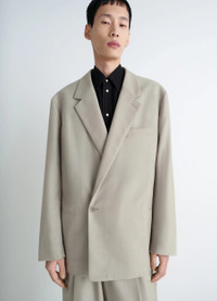 This double-breasted tailored jacket is made from a tropical wool-blend suiting fabric characterized by its mottled appearance and dense, supple hand. This piece is part of a desire to deconstruct the garment and reinterpret the world of the traditional tailoring by giving it greater suppleness. The model is 187 cm tall and is wearing a size 48 (M). This double-breasted tailored jacket is made from a tropical wool-blend suiting fabric characterized by its mottled appearance and dense, supple hand. This piece is part of a desire to deconstruct the garment and reinterpret the world of the traditional tailoring by giving it greater suppleness. The model is 187 cm tall and is wearing a size 48 (M). DETAILS Double-breasted suit jacket in tropical wool blend Straight cut Fully lined model Tailored collar with buttonhole and under-button collar Long sleeves Chest pockets Welted side pockets Welted inside pockets, including one buttoned Interior strap with buttonhole for crossbody wear Made in Slovakia Style : JA1063 LF414 The model is 187 cm tall and is wearing a size 48 (M). Double-breasted suit jacket in tropical wool blend Straight cut Fully lined model Tailored collar with buttonhole and under-button collar Long sleeves Chest pockets Welted side pockets Welted inside pockets, including one buttoned Interior strap with buttonhole for crossbody wear Made in Slovakia Style : JA1063 LF414 The model is 187 cm tall and is wearing a size 48 (M). CARE Main Material: 55% Polyester 45% Wool Main Lining: 51% Cotton 49% Viscose Second Lining: 100% Cotton Do not wash Do not bleach Do not tumble dry Cool ironing Soft dry clean Main Material: 55% Polyester 45% Wool Main Lining: 51% Cotton 49% Viscose Second Lining: 100% Cotton Do not wash Do not bleach Do not tumble dry Cool ironing Soft dry clean