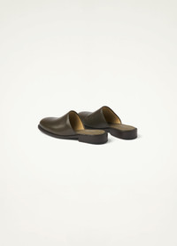 These mules are a staple of LEMAIRE’s footwear collection. They are made of vegetable-tanned buffalo leather - certified LWG Silver - with a shiny finish. Their minimal shape is built from a single piece of leather that is molded over the vamp and the square toe. A small stacked leather heel and rubber insert complete their finishings. DETAILS Leather lining - Square toe - Leather sole - Rubber insert Made in Portugal Style: FO0061 LL0042 FABRICS & CARE Main Fabric: 100% Buffalo Main Lining: 100% Veal - Calf If exposed to water or high humidity, dry your mules well with an absorbent cloth and let them air dry before storing them. You can use a soft cloth and apply a measured amount of uncolored milk or cream to give them a shine.