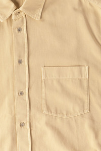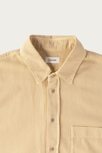 It features a classic collar and a curved hem that adds to its relaxed fit. The front includes a large chest patch pocket, topstitching details, and a buttoning placket with tonal corozo buttons, and a slightly longer back. Custard colorway.