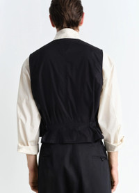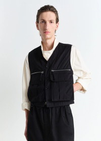 The Collarless Gilet is crafted from a lightweight, naturally water-repelling VENTILE® cotton with a soft hand and a matte finish. This utilitarian-inspired piece features a button-up front and two large vented patch pockets with double pleats for added volume. Above them, two zipped pockets with drawcords provide additional functionality. A D-ring detail is integrated into one pocket to attach keys. The back features an external grosgrain adjuster system that cinches the lower waist, allowing for a customizable fit. Fully lined, the gilet includes interior patch pockets and a LEMAIRE and Ventile® double branding. DETAILS - Relaxed fit - Water repellent - Buttoned fly - Fully lined - Two zipped front pockets - Internal patch pocket - Drawcords - Back adjuster - D-ring detail to attach keys - LEMAIRE and VENTILE® signature Made in Lithuania Style: OW1116 LF1371 The Model is 188cm / 6'2'' ft and is wearing a size 48 (M). FABRICS & CARE Main Fabric: 100% Cotton Main Lining: 100% Cotton Do not wash Do not bleach Do not tumble dry Cool ironing Soft dry clean Discover the traceability