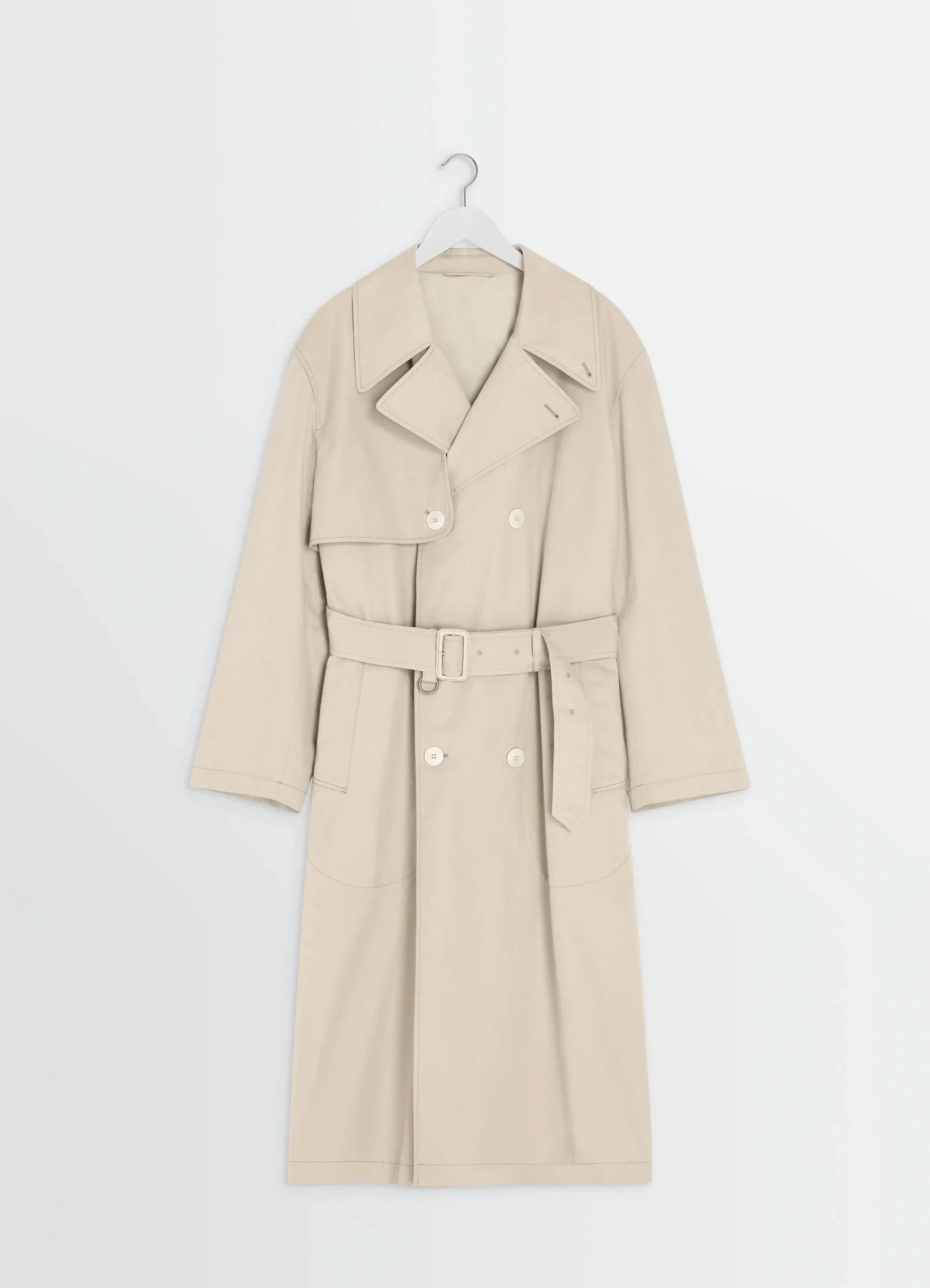 This trench coat is made from Ventile® cotton, a lightweight, naturally water-repellent fabric with a soft hand and a smooth, matte appearance. These properties make it a timeless, functional piece, ideal for mid-season. The model is 187 cm tall and is wearing a size 48 (M). This trench coat is made from Ventile® cotton, a lightweight, naturally water-repellent fabric with a soft hand and a smooth, matte appearance. These properties make it a timeless, functional piece, ideal for mid-season. The model is 187 cm tall and is wearing a size 48 (M). DETAILS Long trench coat in water-repellent Ventile® cotton twill br>Oversized cut Semi-lined model Trench collar with buttonholes and under-collar buttons Buttoned storm flap Long sleeves Double-breasted closure Side pockets Belt loops at the back Removable belt with leather-wrapped buckle and metal rings Buttoned back vent Zipped inside pockets Made in Lithuania Style : CO1126 LF1441 Long trench coat in water-repellent Ventile® cotton twill br>Oversized cut Semi-lined model Trench collar with buttonholes and under-collar buttons Buttoned storm flap Long sleeves Double-breasted closure Side pockets Belt loops at the back Removable belt with leather-wrapped buckle and metal rings Buttoned back vent Zipped inside pockets Made in Lithuania Style : CO1126 LF1441 CARE Main Material: 100% Cotton Main Lining: 58% Polyamide 42% Polyester Second Lining: 100% Cotton Technichal materials: 100% Cow Leather Main Material: 100% Cotton Main Lining: 58% Polyamide 42% Polyester Second Lining: 100% Cotton Technichal materials: 100% Cow Leather
