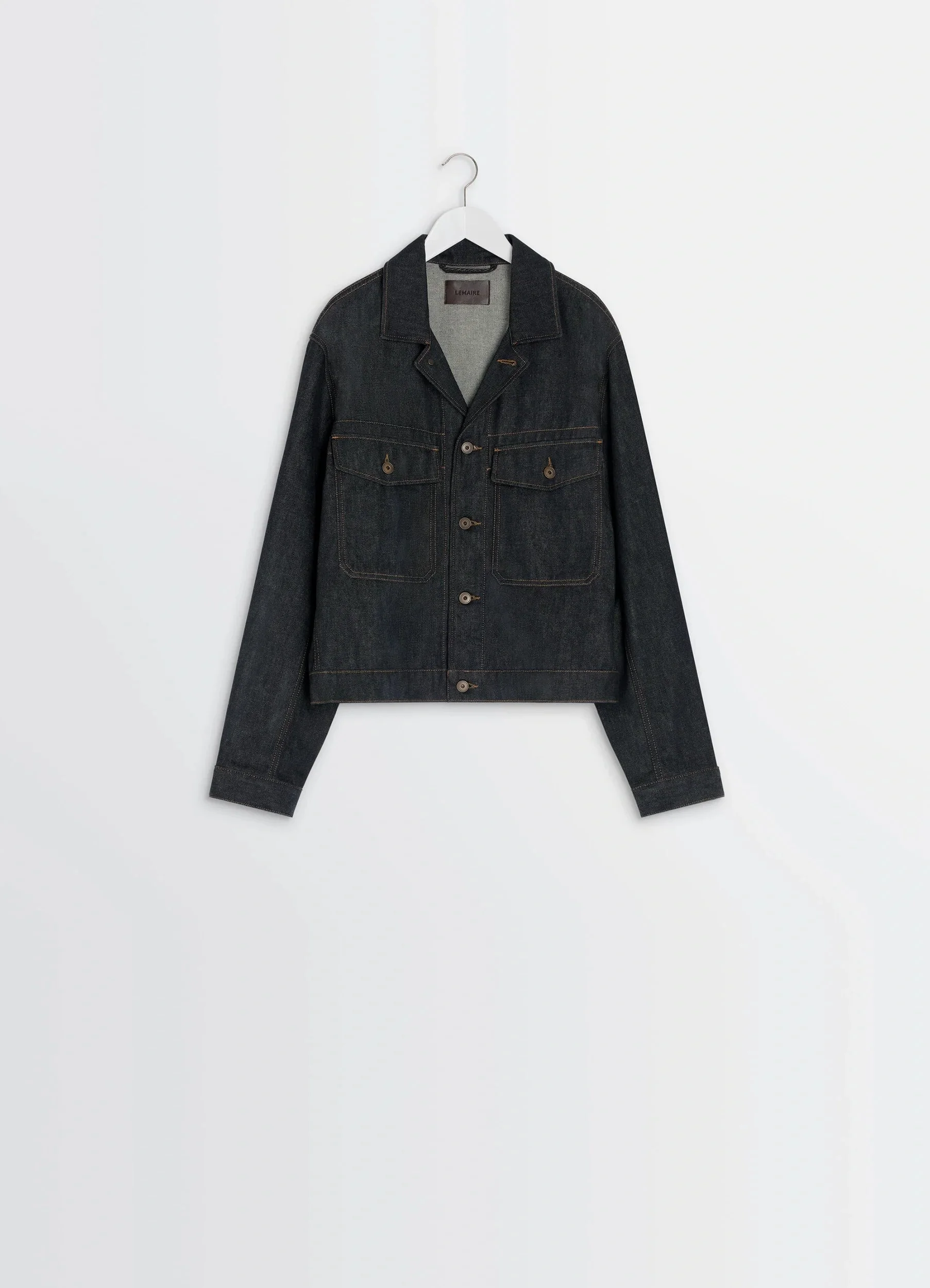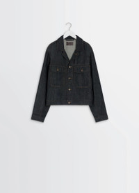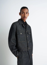 This trucker jacket is an emblematic piece in Lemaire's workwear wardrobe. It is crafted in thick, yarn-dyed slate denim with a raw hand, adding a sophisticated touch to the silhouette. DETAILS Trucker jacket in yarn-dyed heavy slate denim Straight cut Shirt collar Front button closure Long sleeves Straight buttoned cuffs Chest patch pockets with button flaps Adjustable tabs at the waistband Metal buttons with ornamental trim Contrast topstitching Interior Lemaire embossed leather label Made in Italy Style : OW1188 LD1061 The model is 187 cm tall and is wearing a size 48 (M). FABRICS & CARE Main Material: 100% Cotton Jacron: 100% Cow Leather