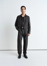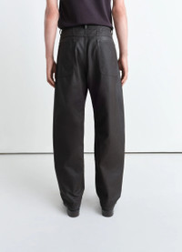 These pants are a reinterpretation of the Twisted Pants, an iconic LEMAIRE staple. They are crafted in shiny coated medium denim, a new LEMAIRE fabric which is soft, very light and reminiscent of leather due to its shiny coating. The Twisted Workwear Pants feature twisted side seams, giving a slightly curved volume to the tapered leg. Their cut is straight and finished with workwear details including a side piped pocket above the knee, a back yoke and two patch pockets in the back. DETAILS - Tapered leg - Zipped fly - Metal button - Side piped pocket above the knee - Two patch pockets in the back - Yoke - Belt loops Made in Romania Style: PA1102 LD1030 The Model is 186cm / 6'1'' ft and is wearing a size 48 (M). FABRICS & CARE Main Fabric: 100% Cotton Main Lining: 100% Cotton Soft wash 30° Do not bleach Do not tumble dry Cool ironing Soft dry clean Wash upside down