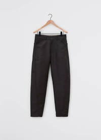 These pants are a reinterpretation of the Twisted Pants, a staple of LEMAIRE’s wardrobe. They are crafted in heavy cotton satin, a fabric sourced from a workwear manufacturer, with a soft and technical hand. It features twisted side seams, giving a slightly curved volume to the tapered leg. Their cut is straight and finished with workwear details including a side piped pocket above the knee, a back yoke and two patch pockets in the back. DETAILS - Relaxed fit - Tapered leg - Zipped fly - Metal button - Side piped pocket above the knee - Two patch pockets in the back - Yoke - Belt loops Made in Morocco Style: PA1161 LF1300 FABRICS & CARE Main Fabric: 65% Cotton / 35% Polyester Main Lining: 100% Cotton Second Lining: 100% Cotton Soft wash 30° Do not bleach Do not tumble dry Cool ironing Soft dry clean