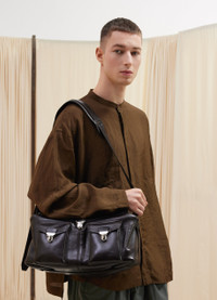 This unisex bag is, at the time, the largest of the Gear line, a new addition to LEMAIRE’s family of accessories. Blending functionality and elegance, its design borrows codes and details of vintage tool bags with a modern twist. The Week-end Gear bag is made of a smooth irregular grained vegetable-tanned leather with a shiny finish. An external back zipped pocket and two front pockets can fit small accessories while the main compartment welcomes daily essentials like a 11x18cm/4x7in book or a 13-inch laptop computer, protected by a zipped closure. An adjustable strap making its way around the bag allows it to be worn in different ways: on the shoulder or cross-body, making the Week-end Gear bag an ideal companion for a short getaway. DETAILS - Suede lining - Adjustable shoulder handle with shoulder pad - Leather strap crossing the inside of the bag - Height of the strap: 37 cm / 14,5-inch - Length: 39 cm / 15,3-inch - Width: 23 cm / 9-inch - Depth: 20 cm / 7,9-inch - Main compartment zip closure (can contain accessories, a 11x18cm/4x7in book, a 13-inch laptop computer) - External back zipped pocket (can contain accessories such as a smartphone) - Two front pockets (can contain small accessories, card holder, AirPods Pro 2 case) - Logo embossed Made in Spain Style: BG0096 LL0067 FABRICS & CARE Main Material: 100% Cow Main Lining: 100% Cow Do not wash Do not bleach Do not tumble dry Do not iron Professional leather clean only