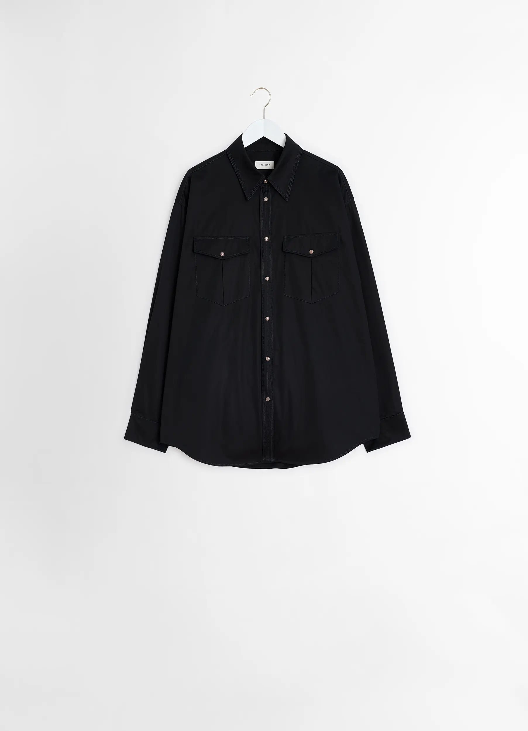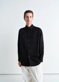 The Western Shirt is crafted from light cotton satin, offering a soft touch and fluid texture with a subtle sheen. Designed with a relaxed fit, it features a low first button for a laid back look. The shirt showcases intricate multi topstitch detailing and a classic western collar adorned with triple topstitch accents. Two western chest pockets with pocket flaps and single pleats add both style and functionality, while the cuffs also display visible topstitching for a refined finish. The closures are made with mother-of-pearl snaps, adding a touch of elegance. Additionally, the back is complemented by an arched yoke with a single pleat. DETAILS - Relaxed fit - Dropped collar - Pointed collar - Two chest pockets with pleats and flaps - Mother-of-pearl snaps with metal edge - Arched back yoke with single pleat Made in Tunisia Style: SH1145 LF1207 The Model is 188cm / 6'2'' ft and is wearing a size 48 (M). FABRICS & CARE Main Fabric: 100% Cotton Soft wash 30° Do not bleach Do not tumble dry Cool ironing Soft dry clean Discover the traceability