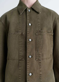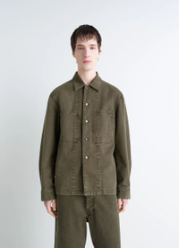 This overshirt reflects Lemaire's love for workwear and reinterpretation of archetypal pieces. It is made from medium-weight denim that has been garment-dyed to give it a snowy patina. The combined effects of dyeing and washing soften the fabric, giving this piece greater comfort. The model is 187 cm tall and is wearing a size 48 (M). DETAILS Workwear overshirt in garment-dyed denim with a snow wash Straight cut Shirt collar Metal button closure Long sleeves Straight buttoned cuffs Chest patch pockets, including a double one Interior Lemaire embossed leather label Made in Morocco Style : OV1024 LD1063 The model is 187 cm tall and is wearing a size 48 (M). CARE Main Material: 100% Cotton Jacron: 100% Cow Leather Soft wash 30° Do not bleach Do not tumble dry Cool ironing Soft dry clean Wash upside down