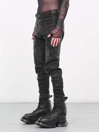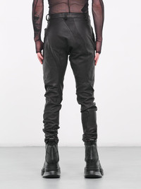 LEON EMANUEL BLANCK trousers in black, horse leather construction, asymmetric paneling, belt loops, off-set button & exposed zip closure, side seam pockets, hem zip vents, tapered leg, skinny fit. Made in Germany 100% Horse Leather European Sizing Model is 6’0” wearing size 48. Shoulders: 19" Chest: 38” Waist: 30”
