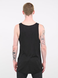 LEON EMANUEL BLANCK tank top in black, merino wool jersey construction, asymmetric paneling, scoop neck, sleeveless, armscyes, curved hem, regular fit. Made in Germany 100% Merino Wool European Sizing Model is 6’0” wearing size 46. Shoulders: 19" Chest: 38” Waist: 30”