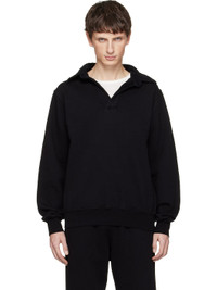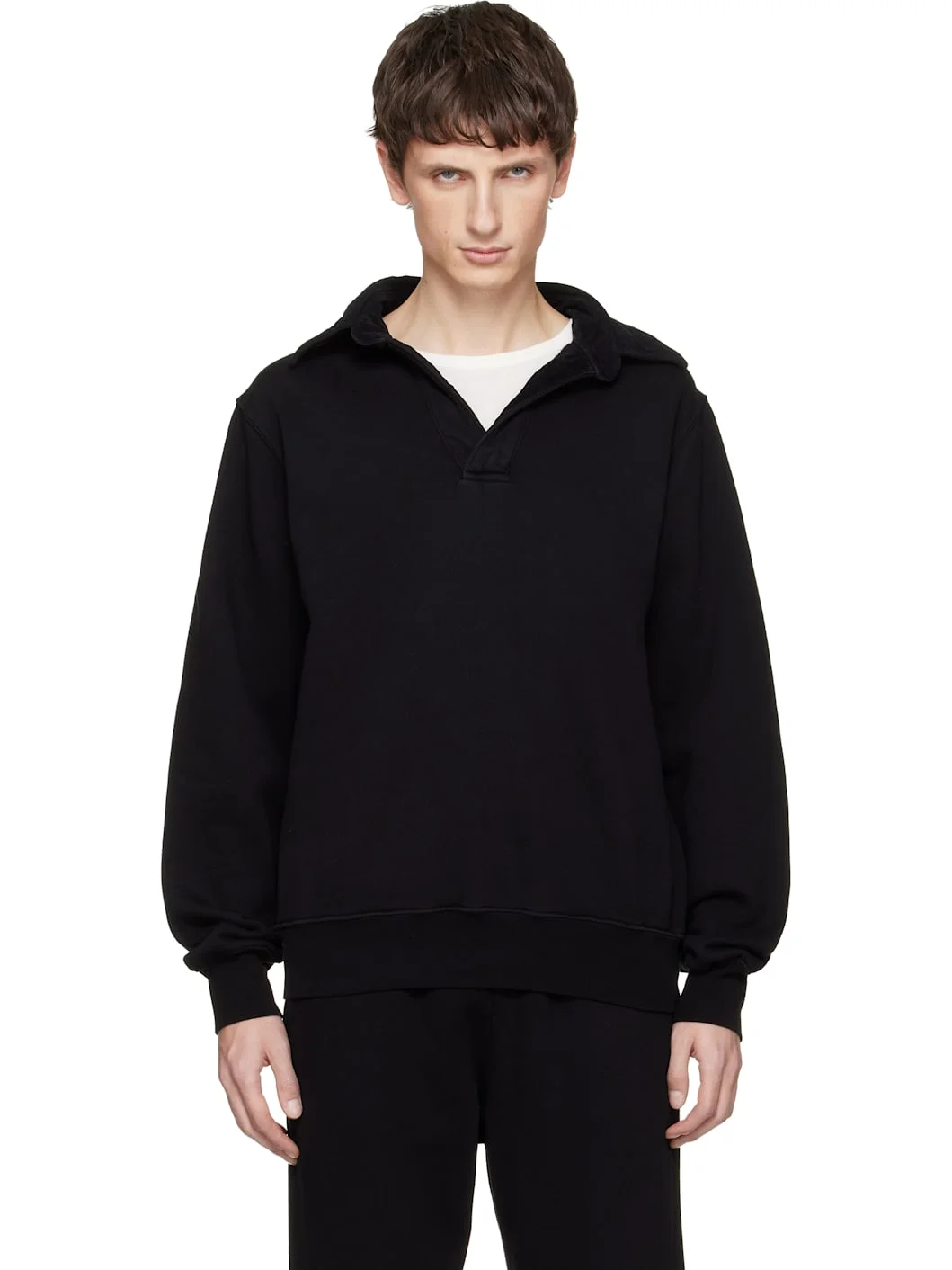 Heavyweight brushed cotton fleece polo. · Pre-shrunk and garment-dyed · Spread collar · Open placket · Rib-knit hem and cuffs Supplier color: Jet black 100% cotton. Made in United States 261548M212002