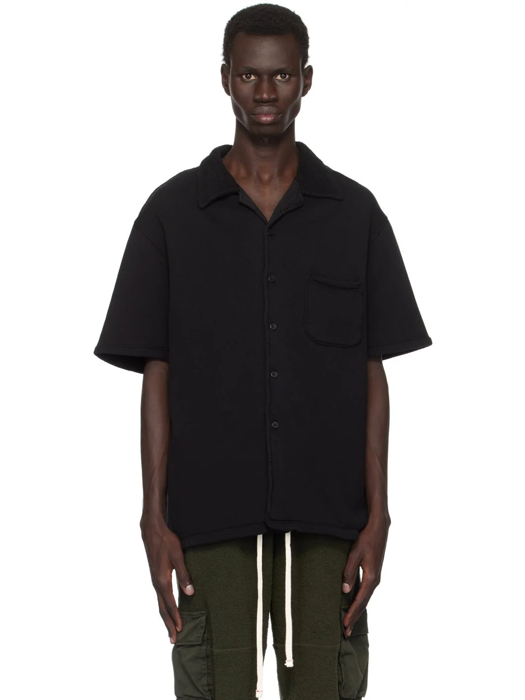 Relaxed-fit heavyweight brushed cotton fleece shirt. · Pre-shrunk and garment-dyed · Open spread collar · Button closure · Patch pocket · Dropped shoulders · Corozo hardware Supplier color: Jet black 100% cotton. Made in United States 242548M192003