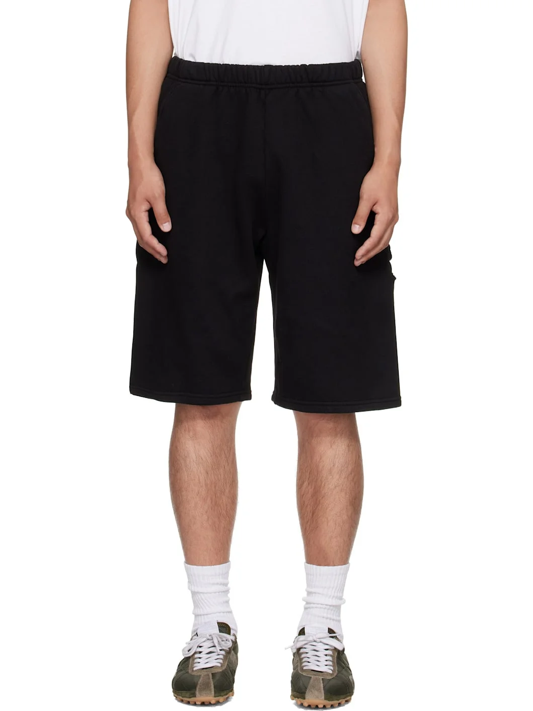 Heavyweight brushed cotton fleece shorts. · Pre-shrunk and garment-dyed · Concealed drawstring at elasticized waistband · Four-pocket styling · Hammer loop and patch pocket at outseam · Rolled raw edges at back pockets Supplier color: Jet black 100% cotton. Made in United States 252548M193001