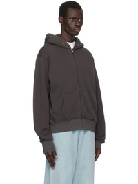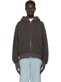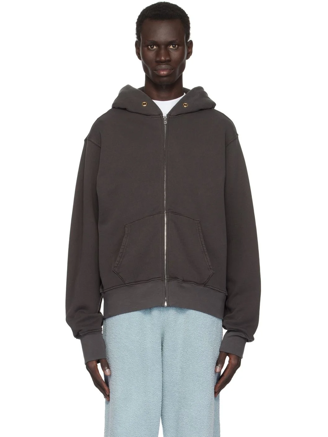 Relaxed-fit heavyweight brushed cotton fleece hoodie. Fading throughout. · Pre-shrunk and garment-dyed · Eyelets at hood · Zip closure · Patch pockets · Rib-knit hem and cuffs · Dropped shoulders Supplier color: Vintage black Body: 100% cotton. Trim: 93% cotton, 7% spandex. Made in United States 242548M202007