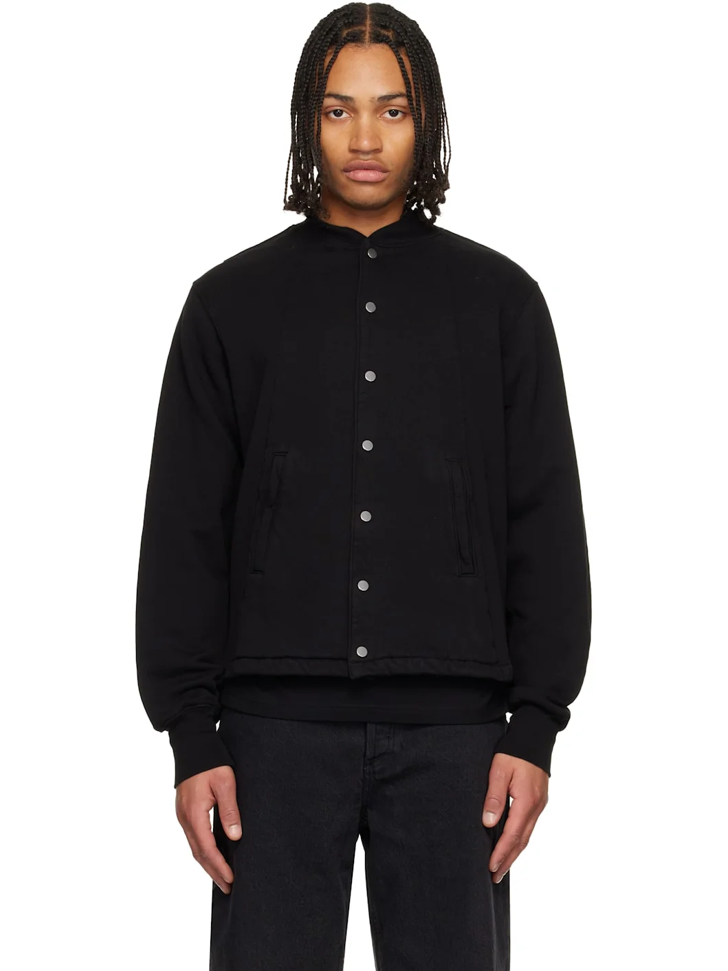 Heavyweight brushed cotton fleece jacket. · Pre-shrunk and garment-dyed · Rib-knit stand collar and cuffs · Press-stud closure · Welt pockets at front Supplier color: Jet black 100% cotton. Made in United States 261548M180001
