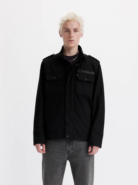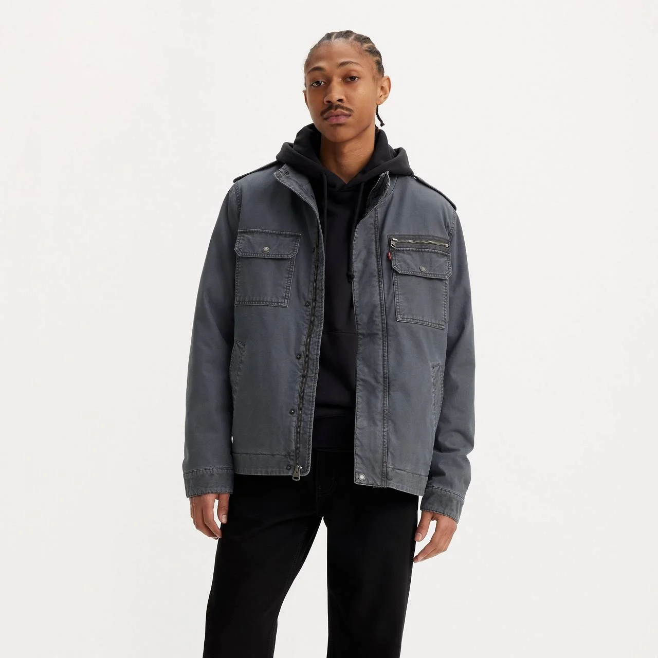 Washed Cotton Military Jacket. Center front zipper closure with snap buttoned placket. Offers ample storage with two chest flap pockets with snaps, one welt zipper pocket above left chest pocket, two lower welt pockets and one interior safety pocket. Quilted lining for added warmth. Exposed zipper detail on collar, adjustable snap cuffs and epaulettes on shoulders. Signature Levi's red tab on left chest pocket. Style # 594920000 Color: Indigo Grey - Grey Composition & Care - 100% Cotton - Machine wash cold with like colors, delicate cycle, tumble dry low
