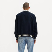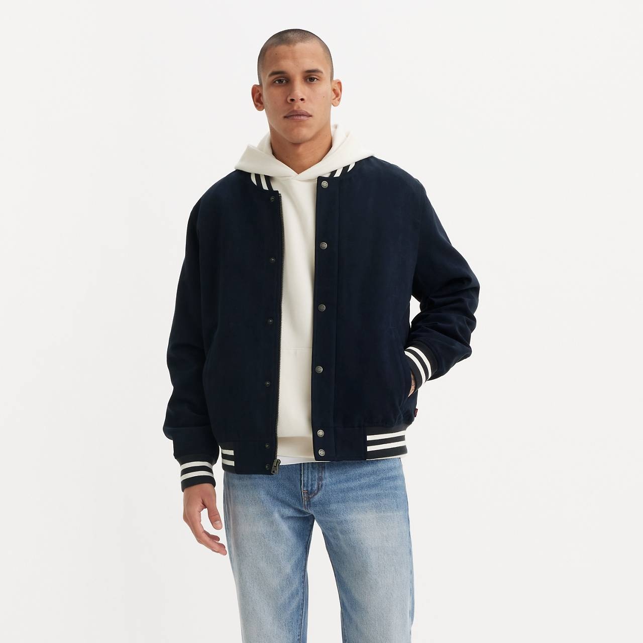 Faux Suede Varsity bomber jacket. Center front zipper closure with snap button placket. Two lower pockets for storage. Double stripe rib knit on cuffs, hem and collar for extra comfort and style. Style # 594910405 Color: Navy - Blue Composition & Care - 100% Polyester - Machine wash cold with like colors, delicate cycle, tumble dry low