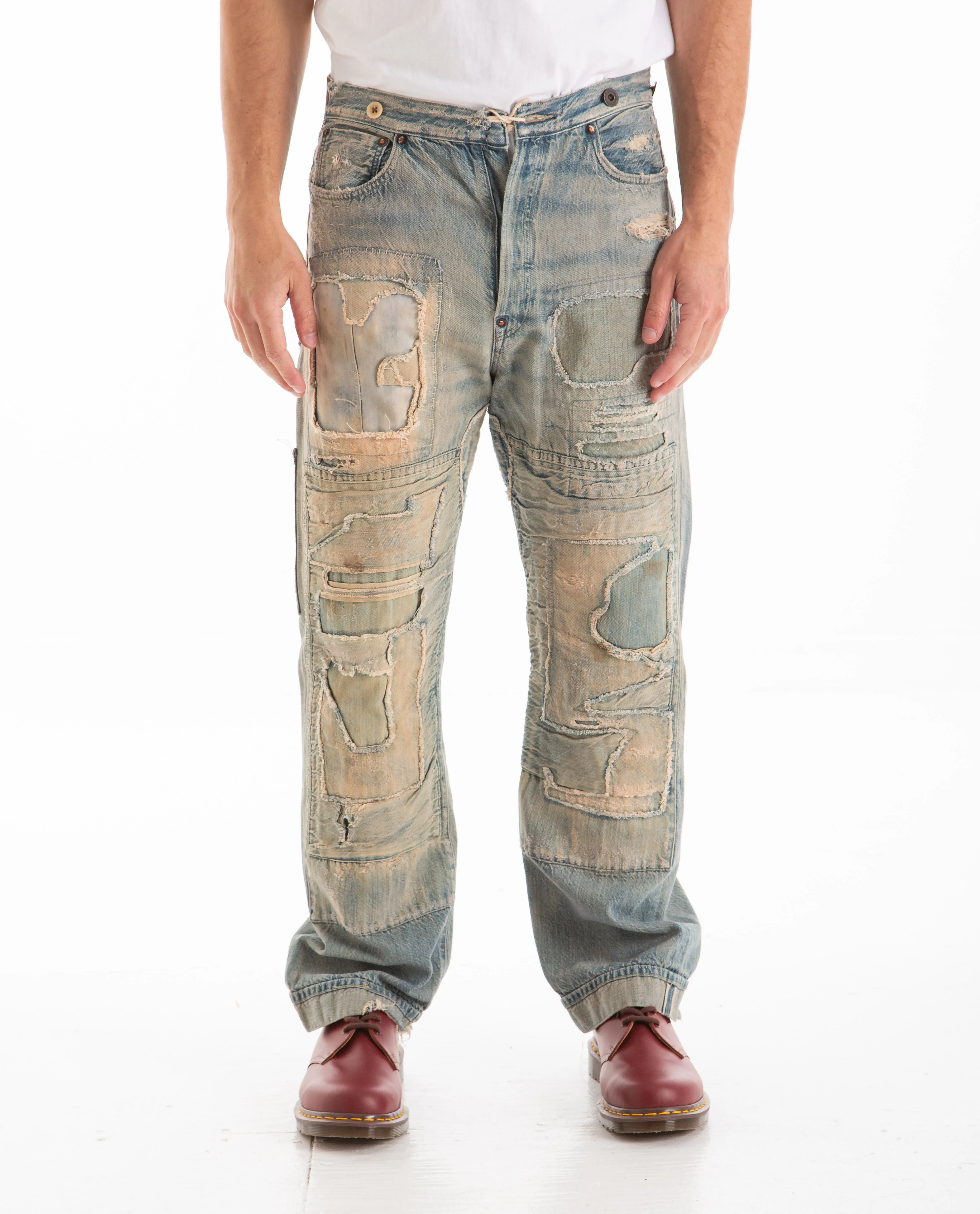 Homer Campbell 501 in indigo by Levi's Vintage Clothing. In 1920, a miner from Arizona named Homer Campbell put Levi's guarantee, "A New Pair Free if They Rip," to the test by returning his heavily-worn and patched 501 jeans. A stitch-for-stitch replica of Homer Campbell's 501 jeans is now available, featuring a boxy, straight-leg fit that sits high on the waist, two back pockets with exposed rivets, and a center-back cinch. The jeans also come with pre-existing and replaced suspender buttons and are finished with single-needle arcuate stitching. These durable selvedge jeans were woven on a traditional narrow-width shuttle loom, making them highly coveted. You can also roll up the cuff to show off the selvedge ID. It's important to note that this is a limited-edition item, with only 250 pieces made available. Store ID: A1764-0000 Model is wearing size: 32X29 Model is: 5'11", Chest 42", Waist 32" 100% Cotton Wash Cold Imported