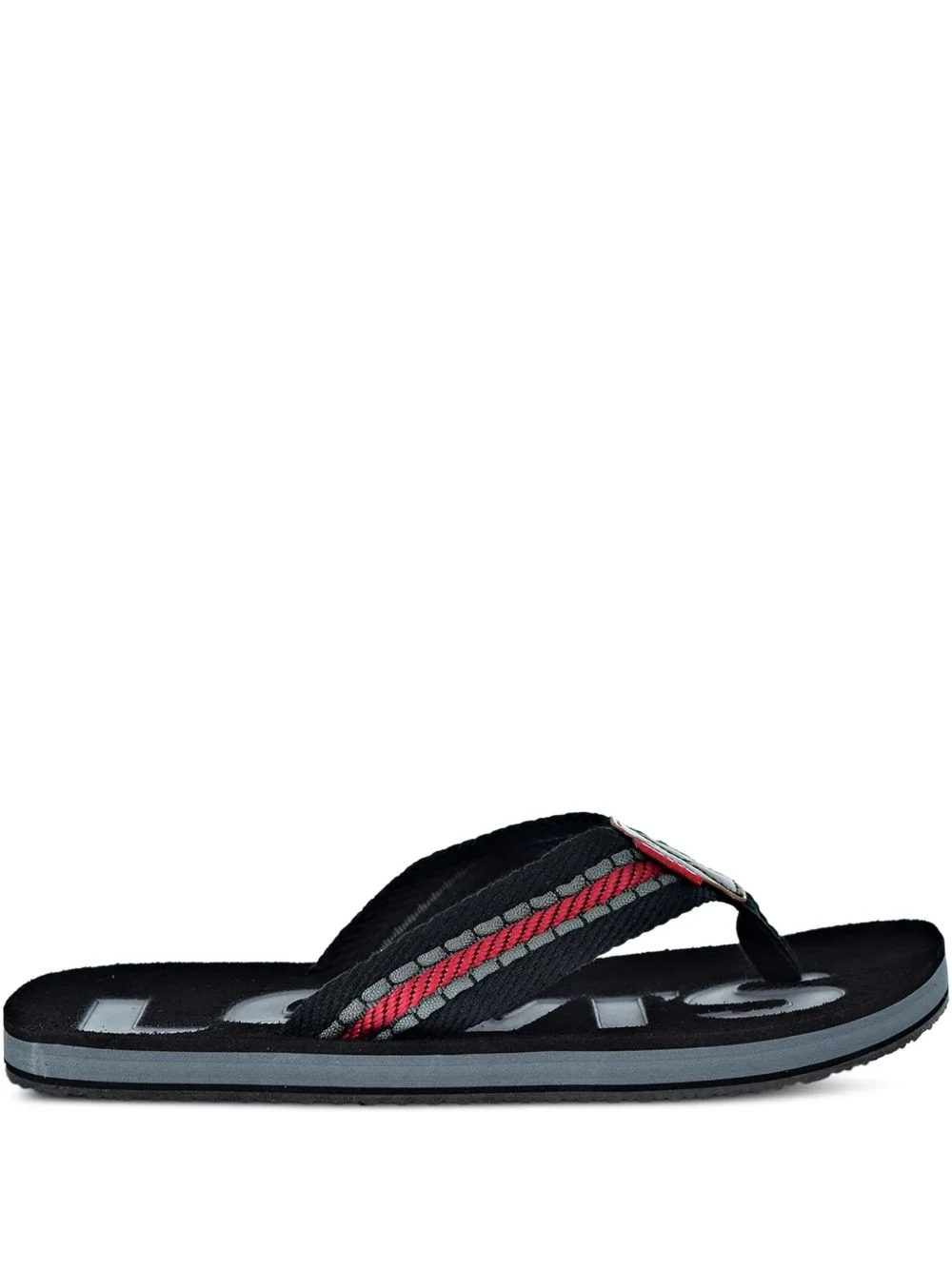 Kyle flip flops Highlights - Black - Grey and red striped strap - Logo lettering - Flat sole - Textured footbed Imported Composition Lining: Rubber 100% Sole: Rubber 100% Outer: Fabric 100%