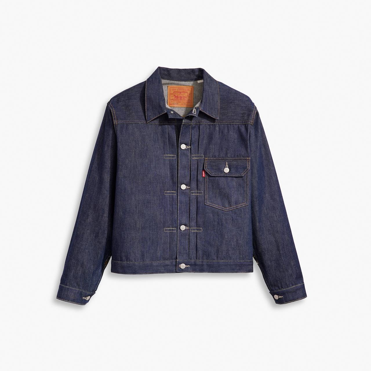 Rarely does a garment symbolize the American workforce like our Levi’s® 1936 Type I Jacket. Made from rigid selvedge denim, it was considered the unofficial uniform of the American working man. True to the original, this jacket features defining details, like the double pleated front, single chest pocket, exposed copper rivets and copper-pronged cinch back for an adjustable fit. 1936 also marks the first year the Big "E" Red Tab™ was added to Levi's® products. - The unofficial uniform of the American workforce - Cut from rigid selvedge denim - Double-pleated front - Features the "Two Horse" lot 506 leather patch, marked XX for quality - Copper-pronged cinch back for an adjustable fit - Exposed copper rivets - Better clothes. Better choices. We made this garment with organically grown cotton, which uses no synthetic pesticides and saves water Style # 705060028 Color: Organic Rigid - Dark Wash How it Fits - Standard fit Composition & Care - 100% Organic Cotton - Denim - Non-Stretch - Button-down collar - Long sleeves - Organic cotton - Machine Wash Cold, Do Not Bleach, Tumble Dry Medium, Hot Iron If Needed, Do Not Dry Clean, Wash Inside Out With Like Colors, Shrinkage In Wash Approximately 10%