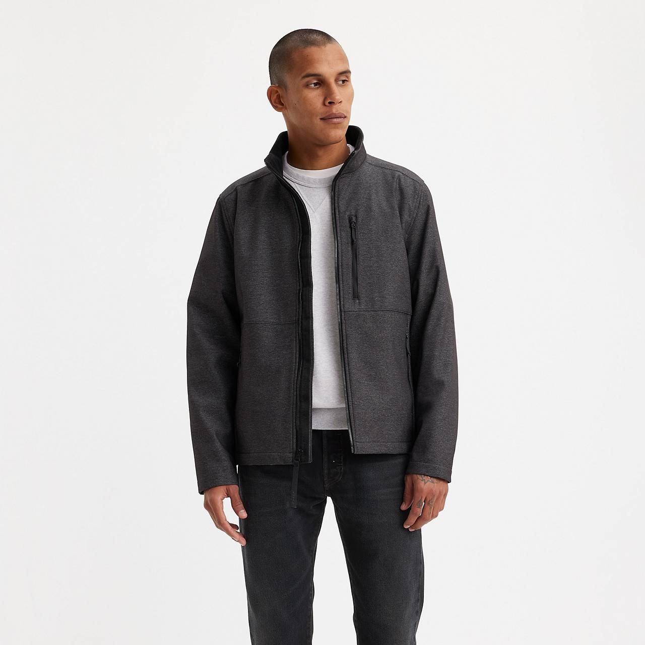 Outer shell constructed using a soft durable lightweight polyester/nylon blend that is both water and wind resistant. Lining bonded with a soft brushed polyester for added comfort. Offers one functional zipper pocket at the left side of chest and dual functional lower pockets. Center front zipper closure with logoed wind fly fully zips up to the stand collar protecting your body and neck from the elements. Signature Levi's red tab at lower left seam. Style # 594910383 Color: Graphite Heather - Grey Composition & Care - SHELL FACE: 81% Nylon 19% Polyester SHELL BACK: 100% Polyester LINING: 100% Polyester - Machine wash cold with like colors, delicate cycle, tumble dry low - Imported