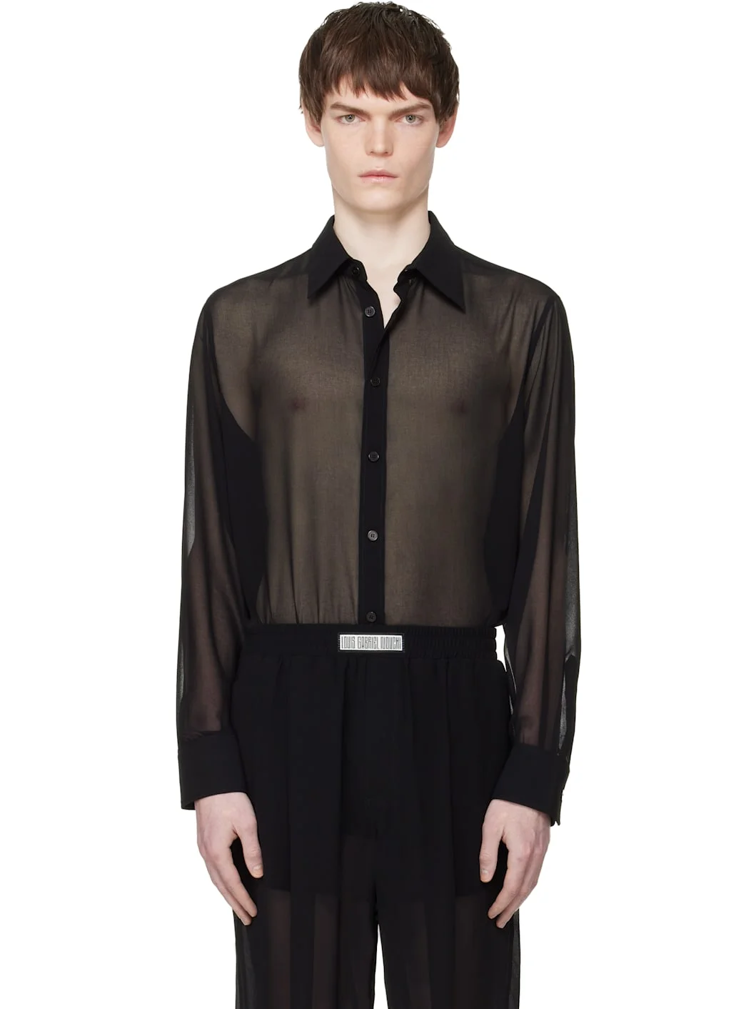 Sheer chiffon shirt. · Spread collar · Button closure · Shirttail hem · Buttoned barrel cuffs · Twin pleats at back yoke Supplier color: Black 100% polyester. Made in France 261617M192002