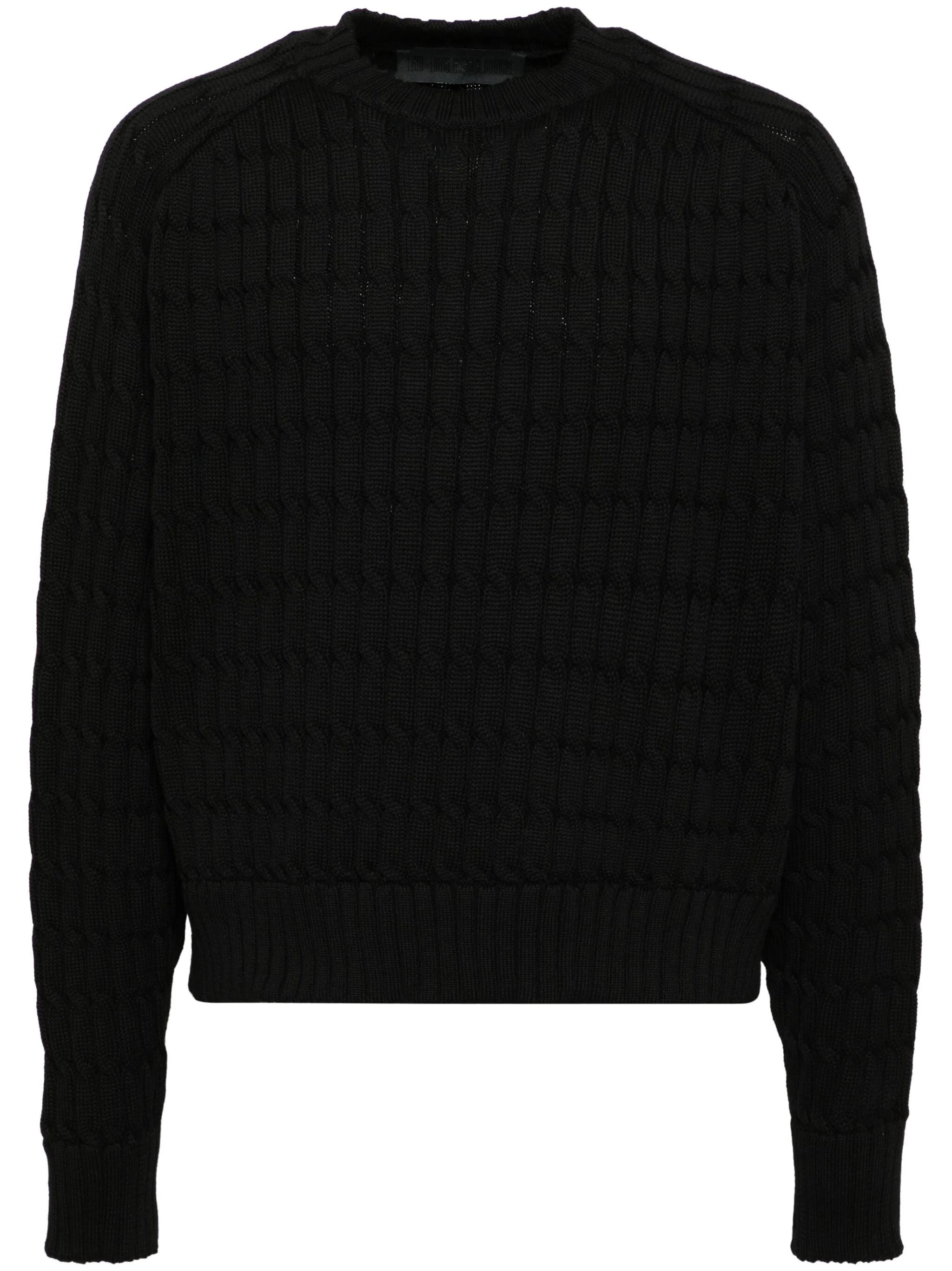 EXPERTLY CRAFTED WITH BLACK WOOL AND A CABLE KNIT DESIGN, THIS CREW NECK PULLOVER SWEATER OFFERS BOTH STYLE AND WARMTH. THE LONG RAGLAN SLEEVES, RIBBED CUFFS, AND HEM PROVIDE A COMFORTABLE FIT FOR ALL-DAY WEAR. A MUST-HAVE ADDITION TO ANY WARDROBE.