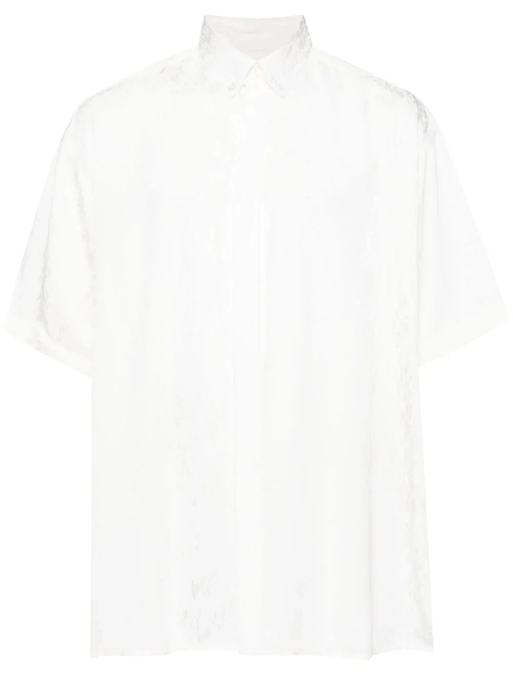 WHITE PATTERNED JACQUARD CUT-OUT DETAILING CLASSIC COLLAR CONCEALED FRONT BUTTON FASTENING SHORT SLEEVES SIDE SLITS STRAIGHT HEM