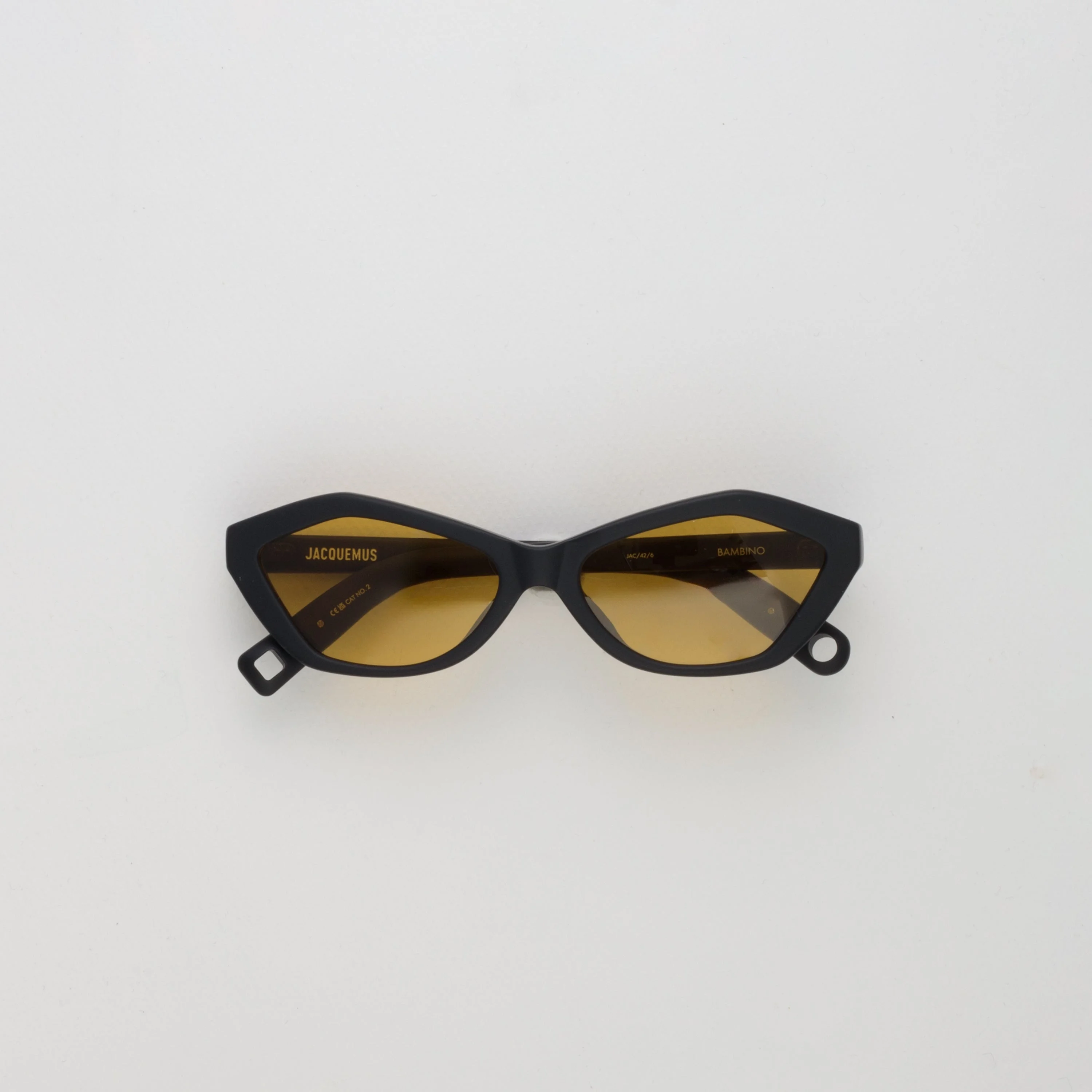 Introducing the Bambino sunglasses from the Jacquemus collaboration. These angular sunglasses in matt black are paired with amber lenses and gold temple detailing. Details -Country of origin: Japan -100% UV protected solid lenses -Acetate frame with acetate temples -Acetate Made in Italy -sku:JAC42C6SUN Size & Fit 56mm lens width 17mm bridge width 140mm temple length "