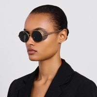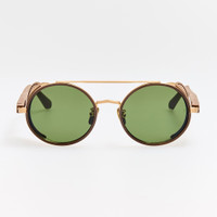 Introducing the Baret Oval frame from the Explorer collection. This style is crafted from matt champagne gold plated pure Japanese titanium. Fitted with green lenses offering full UV protection and adjustable titanium nose pads that offer a tailored fit by allowing bespoke positioning for enhanced comfort. This style includes removable brown rubber side shields and matching temple covers, adding functional protection and striking detail. Each component is interchangeable and available in additional colour options, allowing you to personalize your look and adapt to different environments and styling preferences. Details -Country of origin: Japan -100% UV protected solid lenses Titanium frame with titanium temples -Titanium Made in Japan -sku: LFL1631C2SUN Size & Fit 51mm lens width 19mm bridge width 145mm temple length