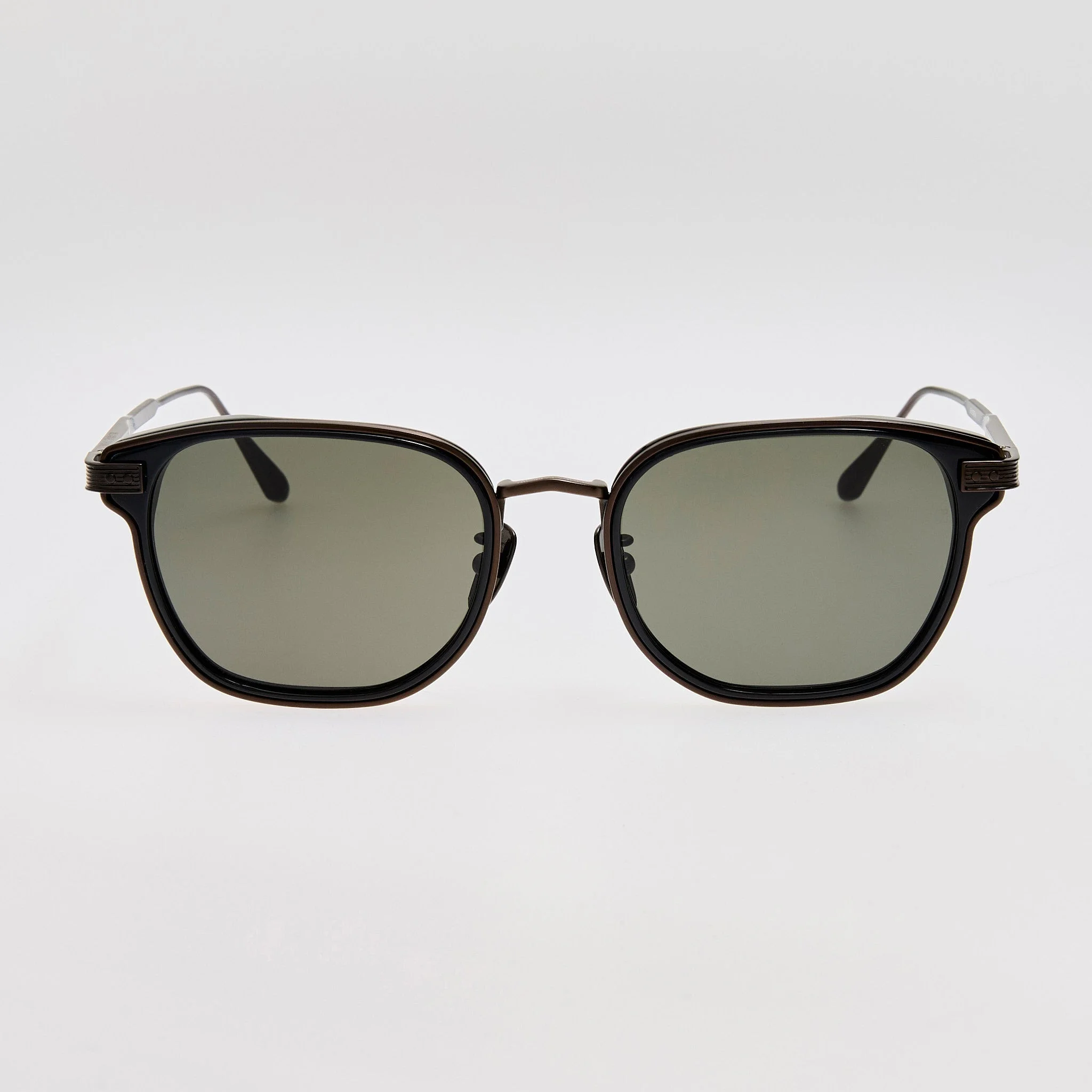 An elevated D-frame silhouette crafted from Italian blakc acetate and contrasting mat nickel pure Japanese titanium temples.This refined frame features a strong architectural brow line, sculpted temples, and adjustable nose pads for enhanced comfort. This frame is fitted with solid grey lenses that offer anti-glare and 100% UV protection. Details -Country of origin: Japan -100% UV protected lenses -Titanium frame with titanium temples -LFL1579C4SUN Size & Fit 52mm lens width 18mm bridge width 145mm temple length