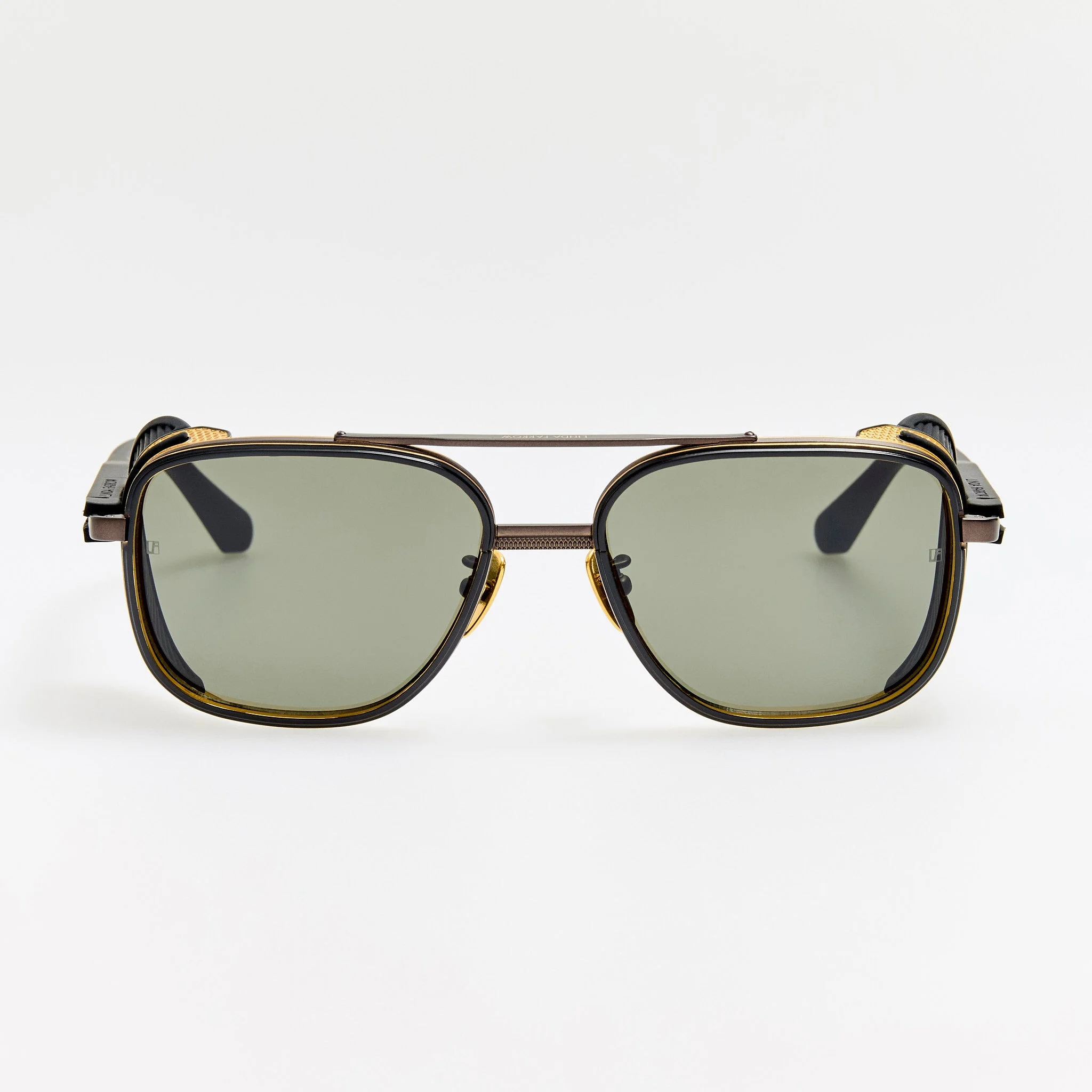 Introducing the the Boyd aviator frame from the Explorer collection. This style is crafted from matt nickel plated pure Japanese titanium with contrasting 22k gold plated titanium details on the temples. Fitted with grey lenses for a tonal all black look it offers complete UV protection. Adjustable titanium nose pads offer a tailored fit by allowing bespoke positioning for enhanced comfort. This style includes removable black rubber side shields and matching temple covers, available in interchangeable colour options to personalize your look. Details -Country of origin: Japan -100% UV protected solid lenses Titanium frame with titanium temples -Titanium Made in Japan -sku: LFL1630C1SUN Size & Fit 55mm lens width 18mm bridge width 145mm temple length