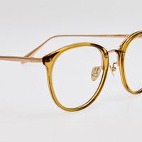 The Cathorpe oval frame is finely sculpted khaki acetate rims and paired with 22 carat light gold plated Japanese titanium frame work which runs along the inner brown and into sleek tapered temples. This frame features adjustable titanium nose pads for superior comfort and fit. Details -Country of origin: Japan -Optical lens free from prescription -Acetate frame with titanium temples -sku:LFL251C104OPT Size & Fit 51mm lens width 20mm bridge width 145mm temple length