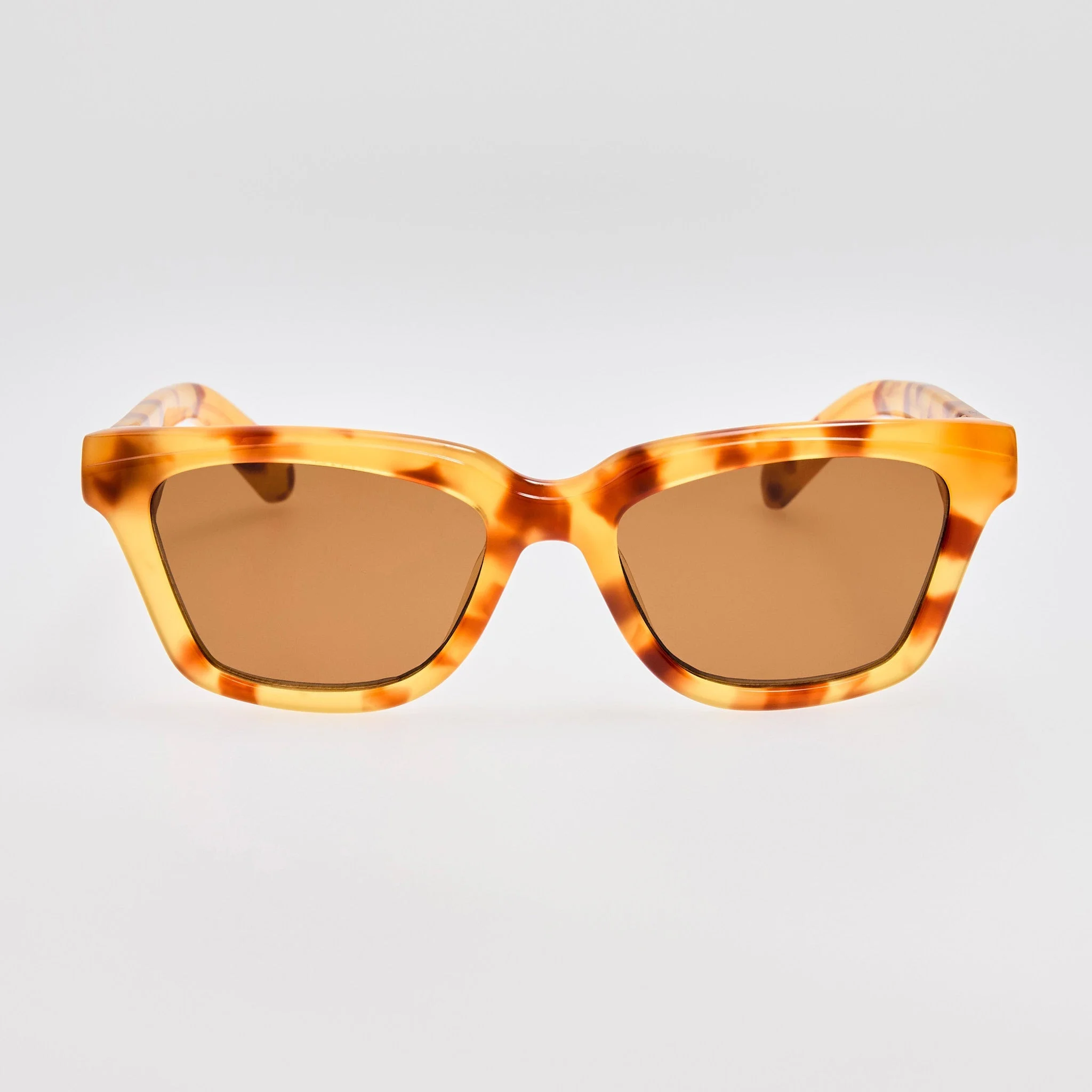 The Carre sunglasses showcase a beige totoiseshell acetate frame shaped into a bold D-frame silhouette. Featuring solid brown lenses, sculpted nose pads ensure a comfortable fit throughout the day. The temples are detailed with silver branding, adding a refined and luxurious touch. Details -Country of origin: Japan -100% UV protected lenses -Acetate frame with acetate temples -sku:JAC109C4SUN Size & Fit 63mm lens width 12mm bridge width 135mm temple length