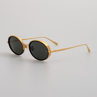 These oval sunglasses from the LINDA FARROW collection combine a yellow gold plated rim with meticulously etched brows for an eye catching finish. Balanced with a sleek tapered temples and fitted with grey ZEISS technology sunglass lenses for optimum clarity and UV protection. Details -100% UV protected solid lenses -Titanium frame with titanium temples -Country of origin : Japan -sku:LFL1413C1SUN Size & Fit 52mm lens width 21mmbridge width 146mm temple length
