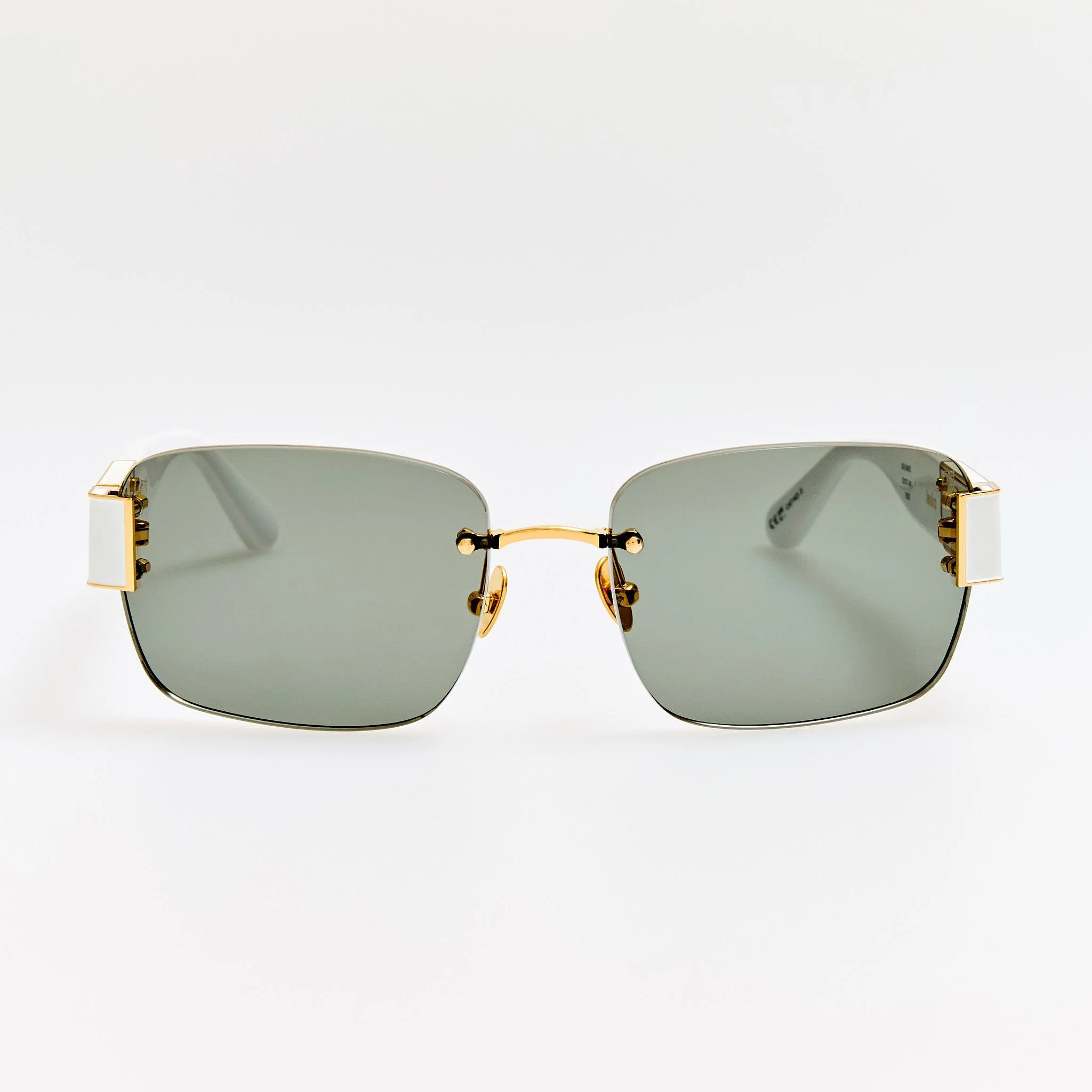 Introducing the Jessica rectangular frame. This rimless sunglasses are engineered with a 4mm glossy edged lens in solid grey and anchored by bold hardware at each corner, white Italian acetate temples inset with our signature 22k plated pure Japanese titanium eyelet bearing the brand logo. The frame is fitted with adjustable titanium nose pads that offer a tailored fit by allowing bespoke positioning for enhanced comfort. Details -Country of origin: Japan -100% UV protected solid lenses -Acetate and titanium frame with titanium temples -sku: LFL1643C2SUN Size & Fit 57mm lens width 17mm bridge width 140mm temple length