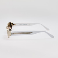 This product is a limited edition of 245. The edition number is printed on the inside of the temple #/245. The Kaia is a rectangular combination frame crafted from 22 karat white gold-plated pure Japanese titanium, paired with contrasting white temples crafted from Italian acetate. This frame is fitted with adjustable nose pads that allow bespoke positioning for enhanced comfort. Finished with solid grey lenses that offer 100% UV protection. Details -Country of origin: Japan -100% UV protected lenses -Titanium frame with acetate temples -sku:LFL1532C2SUN Size & Fit 56mm lens width 18mm bridge width 140mm temple length