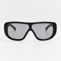 The shield frame is crafted from acetate in black lizard. Fitted with grey lenses offering full UV protection. The frame is fitted with sculpted nose pads. Rooted in French artistry and imagination, Jacquemus blends culture, creativity, and emotion into every design. Renowned for redefining modern fashion with a fresh and poetic approach, the brand continues to captivate a global audience. Linda Farrow and Jacquemus have been working together since Spring/Summer 2024 to deliver a collection of bold sunglasses and optical in innovative shapes, colours, and finishes. Details -Country of origin: Japan -100% UV protected gradient lenses -Acetate frame with acetate temples -Acetate Made in Italy -sku: JAC156C4SUN Size & Fit 130mm lens width 5mm bridge width 140mm temple length