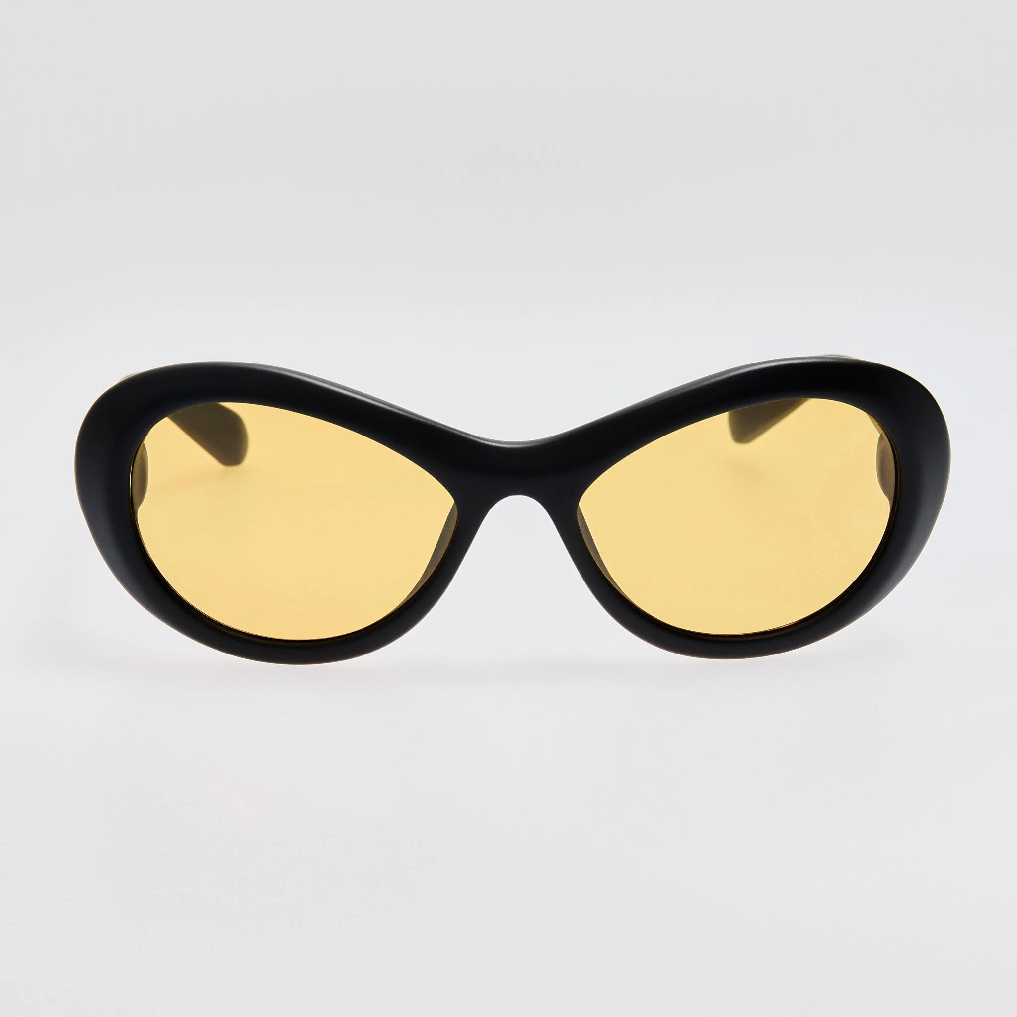 Crafted from matt balck acetate, the Rond sunglasses feature a sleek oval silhouette enhanced with sculpted nose pads for a comfortable fit. The temples are detailed with gold branding while solid amber lenses offer UV protection Details -Country of origin: Japan -100% UV protected lenses -Acetate frame with acetate temples -sku:JAC107C4SUN Size & Fit 63mm lens width 12mm bridge width 135mm temple length