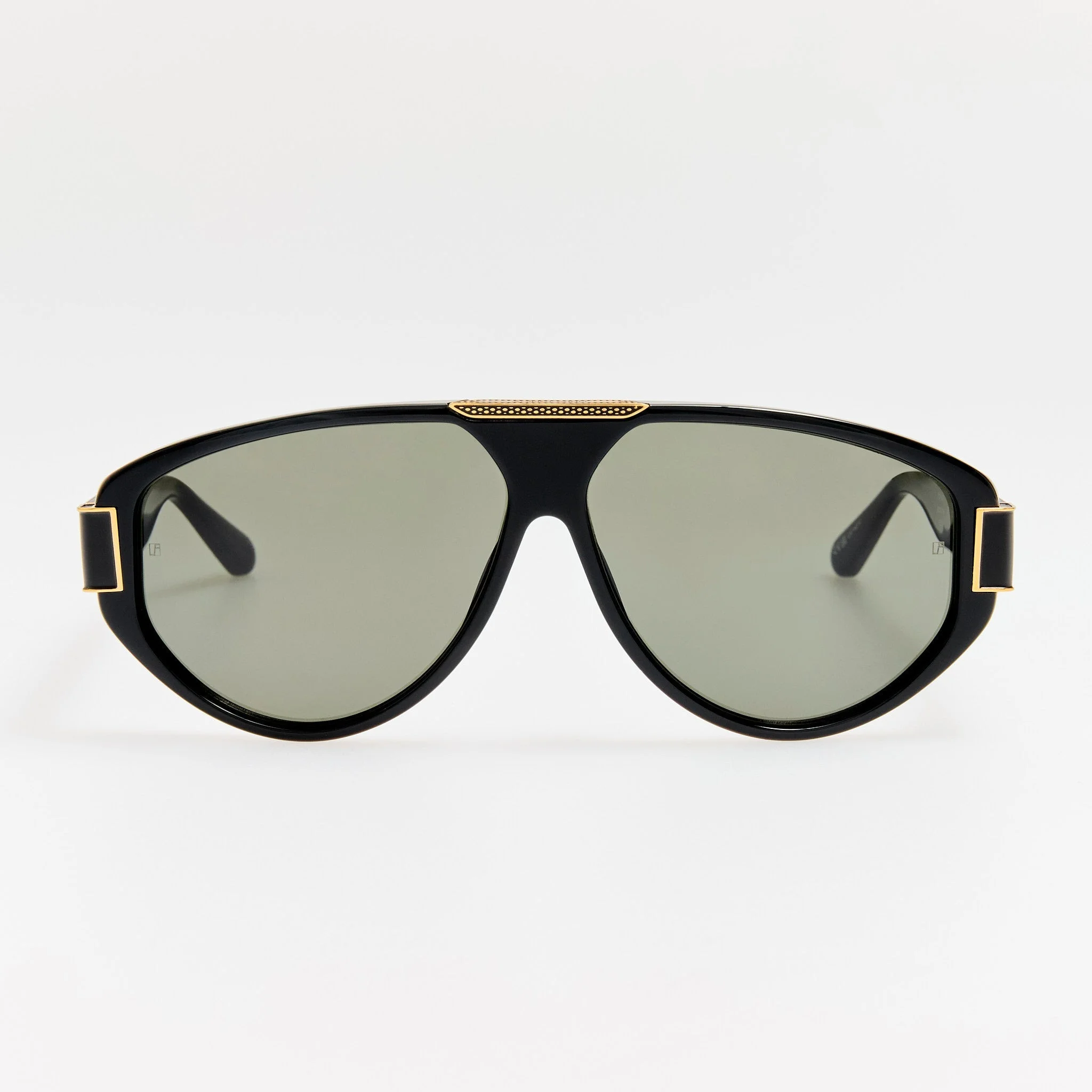 Introducing the Rowan aviator frame, crafted from Italian acetate in black. The temples are inset with our signature 22k gold plated titanium eyelet bearing the brand logo. At the brow, a bespoke hardware plate features engine-turned detailing and the LINDA FARROW logo. Fitted with grey lenses offering full UV protection and sculpted nose pads for a tailored fit. Details -Country of origin: Japan -100% UV protected solid lenses -Acetate frame with acetate temples -Acetate Made in Italy -sku: LFL1653C1SUN Size & Fit 63mm lens width 12mm bridge width 145mm temple length