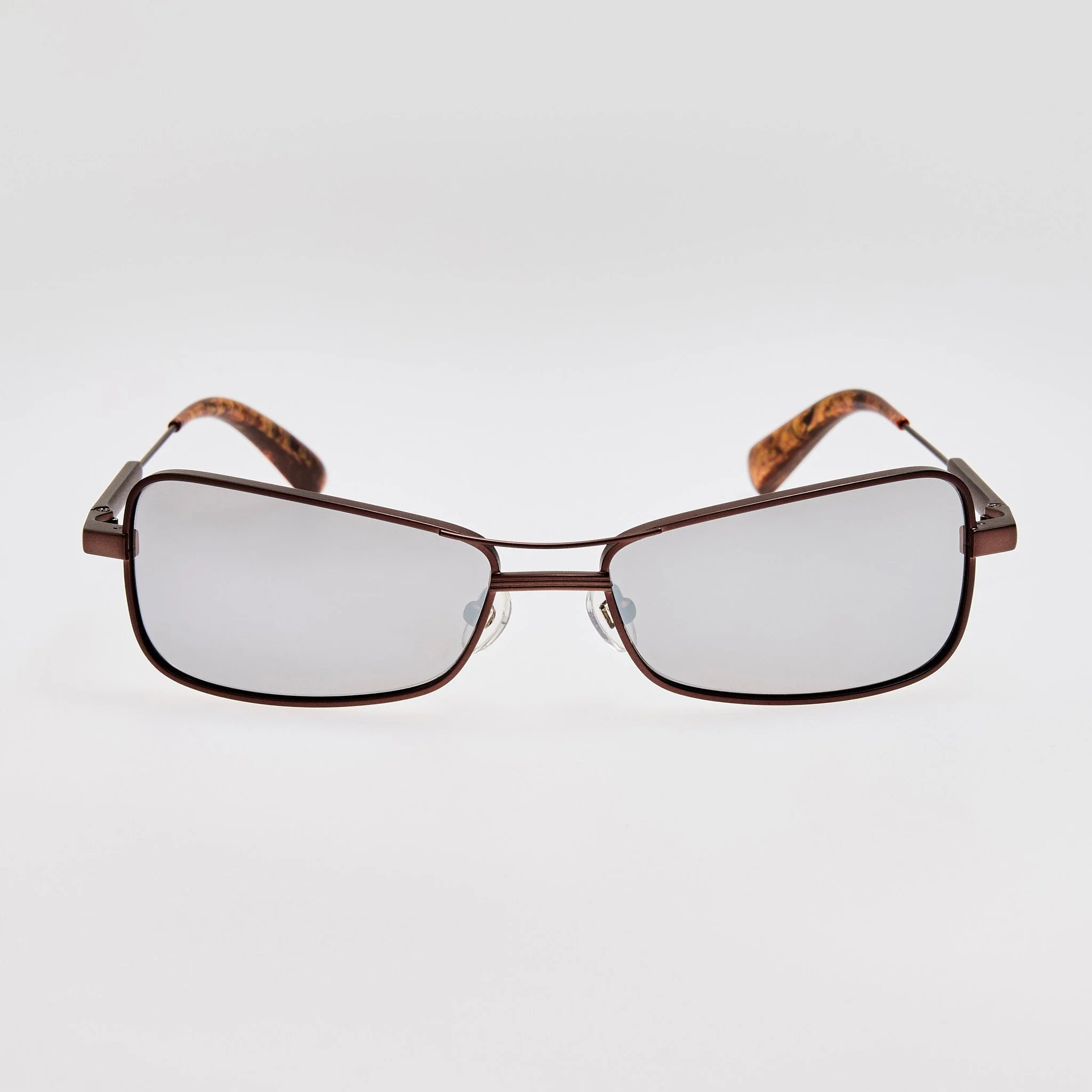 The Statzione sunglasses feature an angular frame crafted from stainless steel in a matte brown finish. Contrasting wood-toned temple tips add a tactile accent. Designed with adjustable nose pads for all-day comfort this frame is fitted with silver lenses that offer 100% UV protection Details -Country of origin: Japan -100% UV protected lenses -Stainless Steel Frame -sku:JAC118C1SUN Size & Fit 63mm lens width 12mm bridge width 135mm temple length