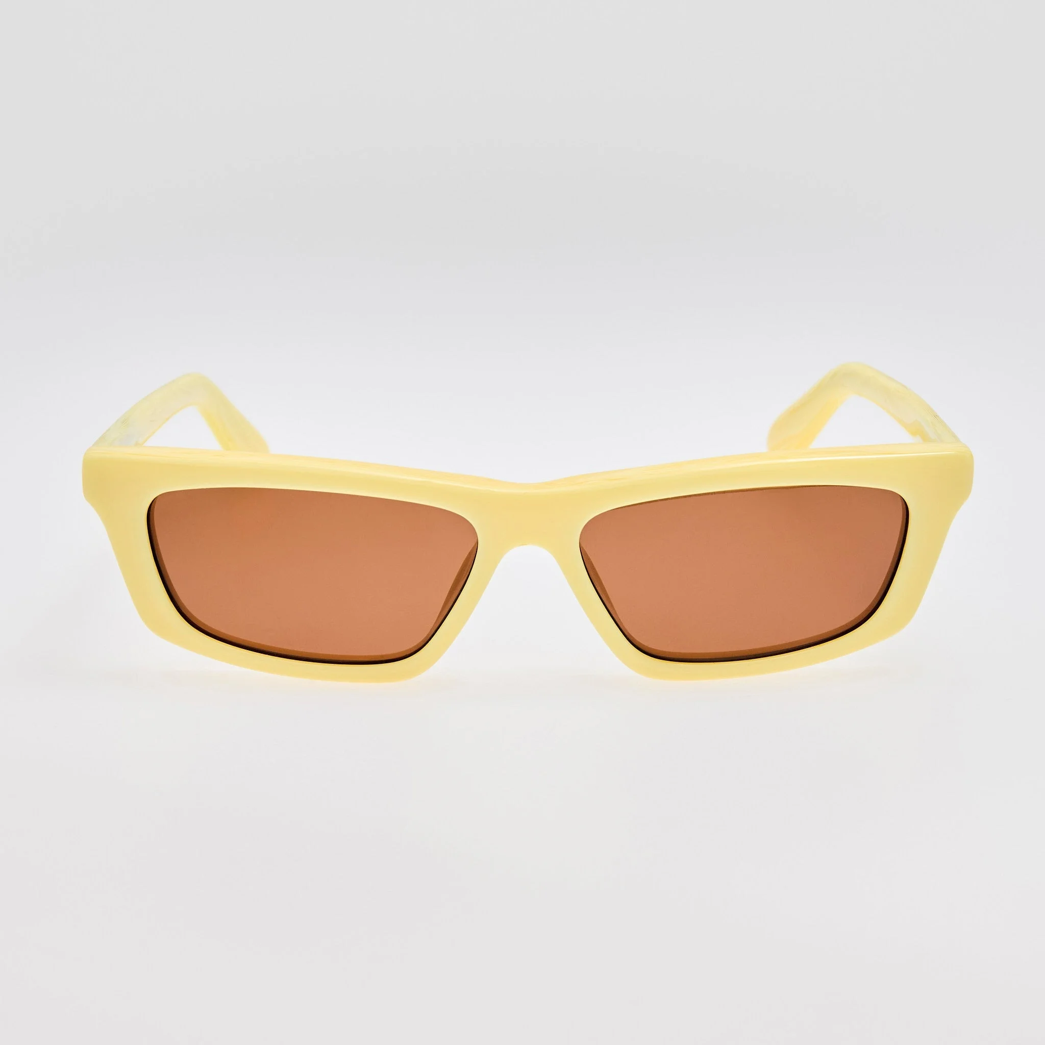 The Trapezi D-frame is realized in classic yellow stripe acetate , solid brown nylon lenses offer 100% UV protection. Designed with sculpted acetate nose pads and temples detailed with refined silver branding. Details -Country of origin: Japan -100% UV protected lenses -Acetate frame with acetate temples -sku:JAC136C3SUN Size & Fit 63mm lens width 12mm bridge width 135mm temple length