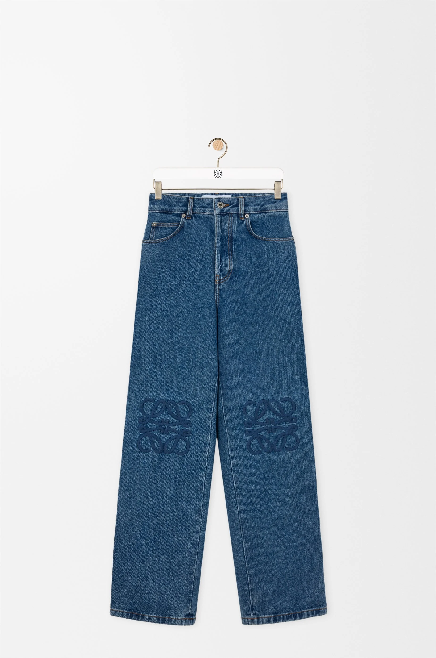 Jeans in medium-weight washed cotton denim featuring an Anagram embroidery at the knees. - Relaxed fit, regular length - Mid waist, loose leg - Concealed button fly - Five pocket style - LOEWE embossed leather patch placed at the back Colour: Jeans Blue Main material: Cotton Weight: 0.9 kg Made in: Italy Materials & care Main Material: 100% cotton