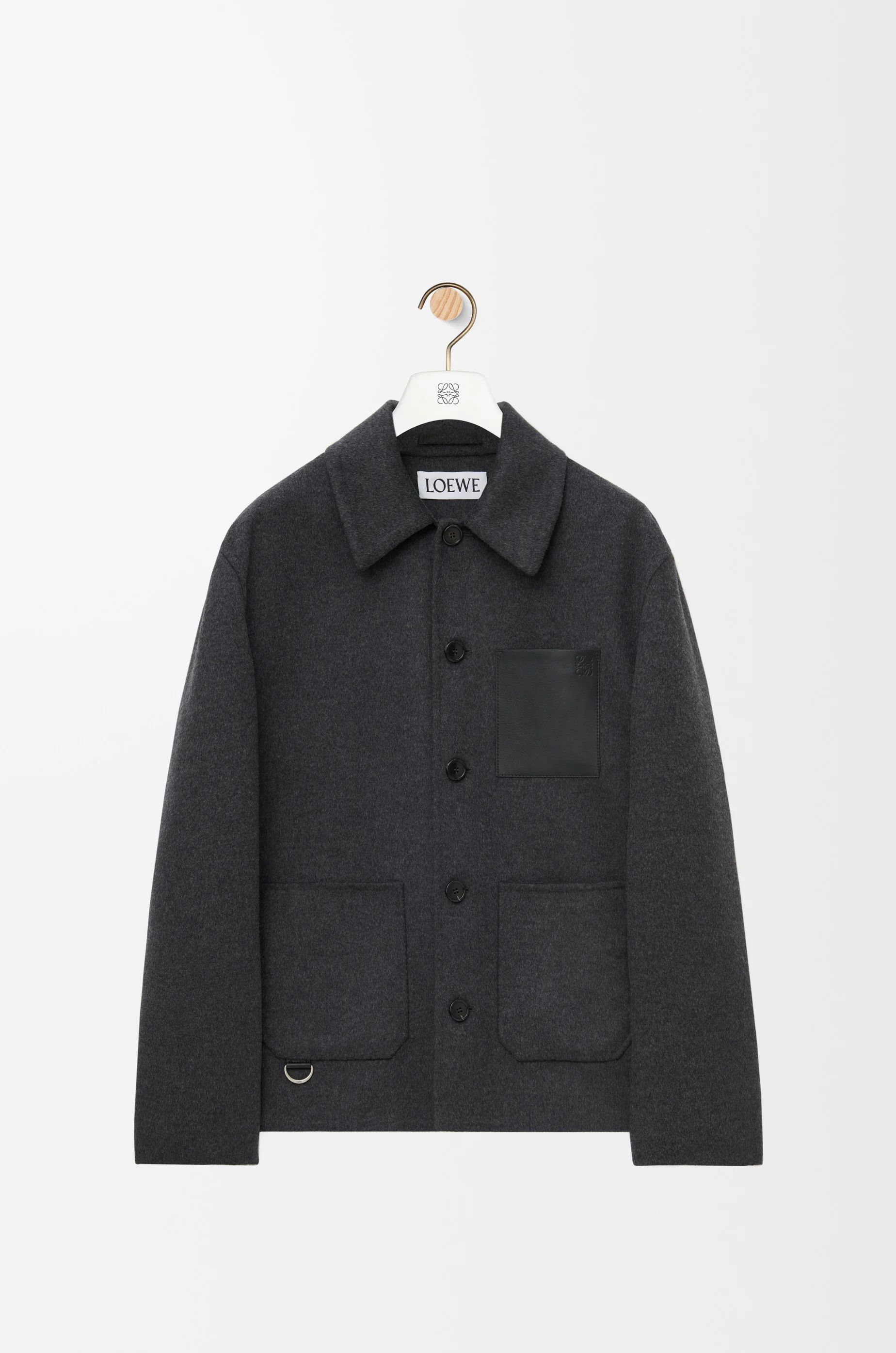 Jacket crafted in lightweight double face wool cashmere. - Regular fit - Regular length - LOEWE engraved horn buttons - Classic collar - Button front fastening - Patch pockets - Anagram embossed leather chest patch pocket - LOEWE engraved D-ring Details - Colour : Charcoal Melange - Main material : Wool/Cashmere - Weight : 1.5 kg - Model ID : H526Y02W93 - Made in : Italy